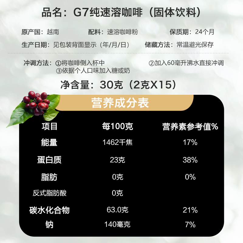 Vietnam original imported coffee Central Plains g7 coffee powder pure black coffee instant coffee powder 30g*3 boxed 45 cups