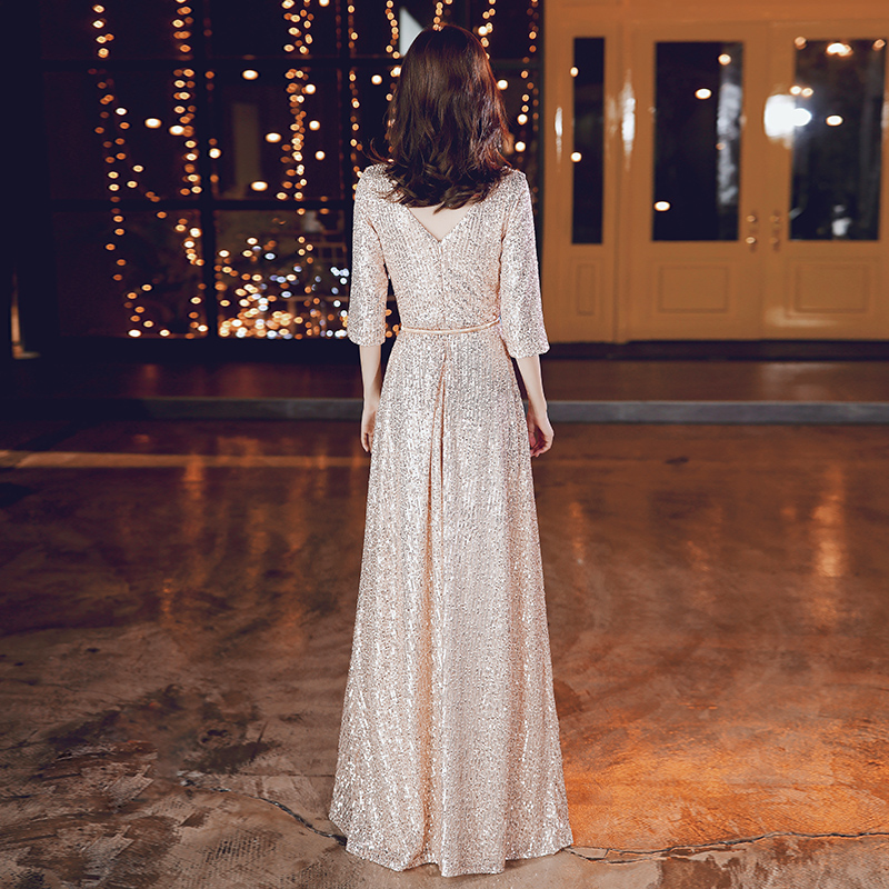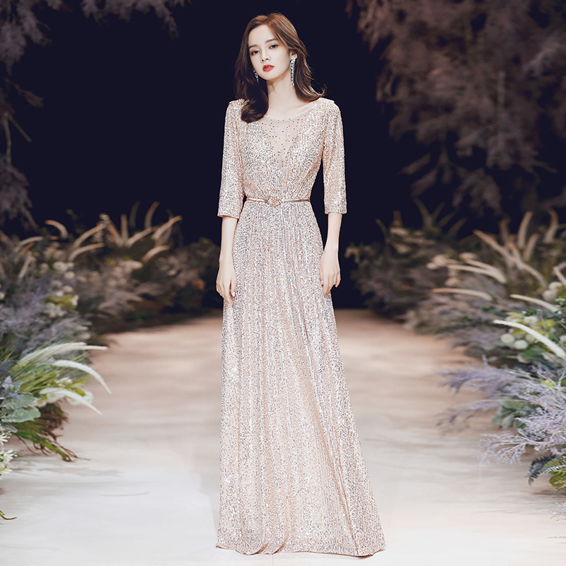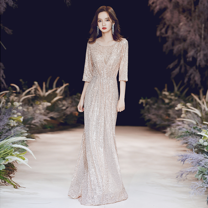 Champagne Golden Evening Gown Lady Banter Temperament High-end Atmosphere Famous LONG VERSION HOST BRIGHT SHIMMERY DRESS WOMAN