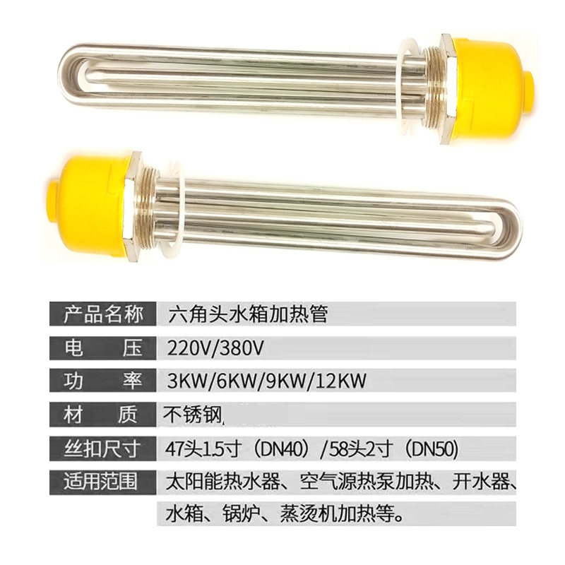 DN40 50 hexagonal head electric heating tube water tank boiler heat conduction oil project air energy heating rod 220V 380V