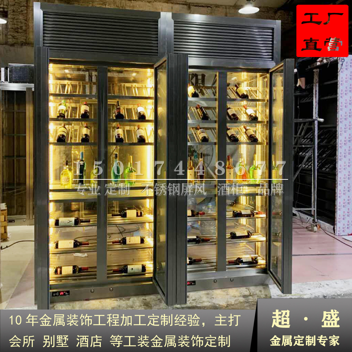 Stainless steel wine cabinet custom drawing warm temperature wine cabinet light luxury style adjustment hotel lobby metal screen wine cabinet factory