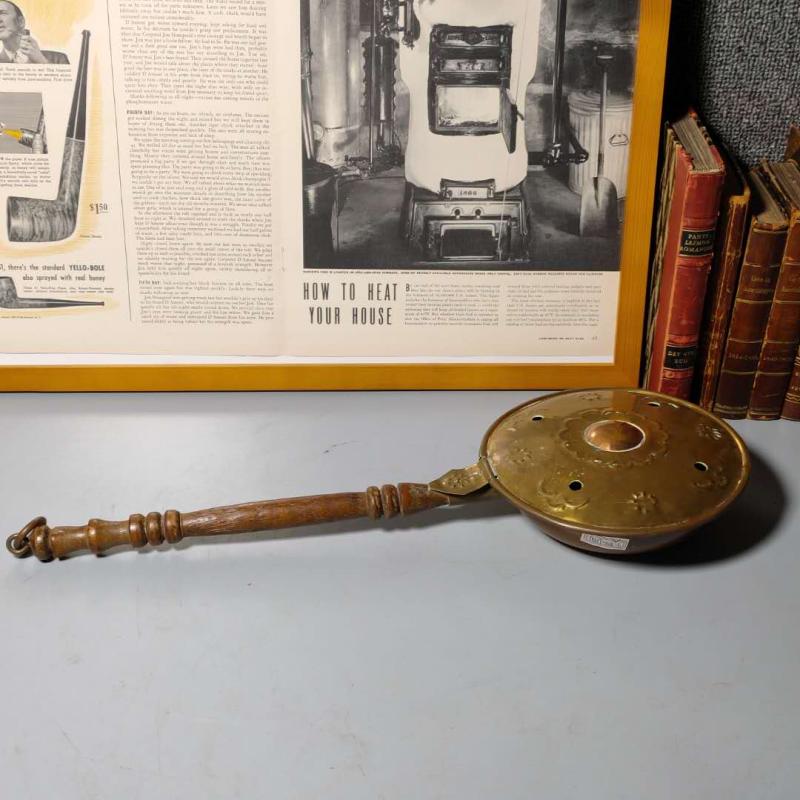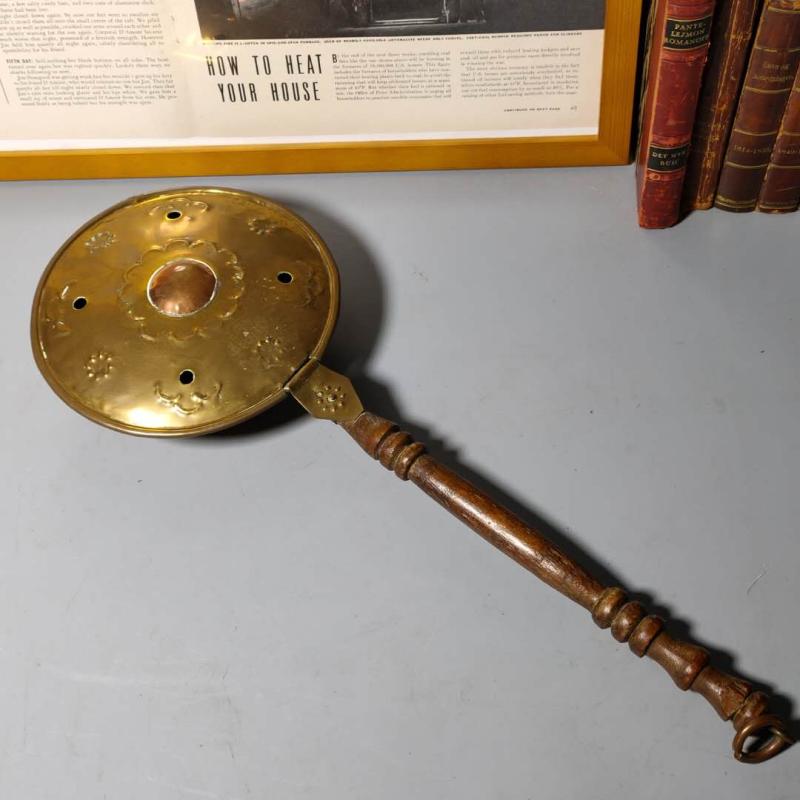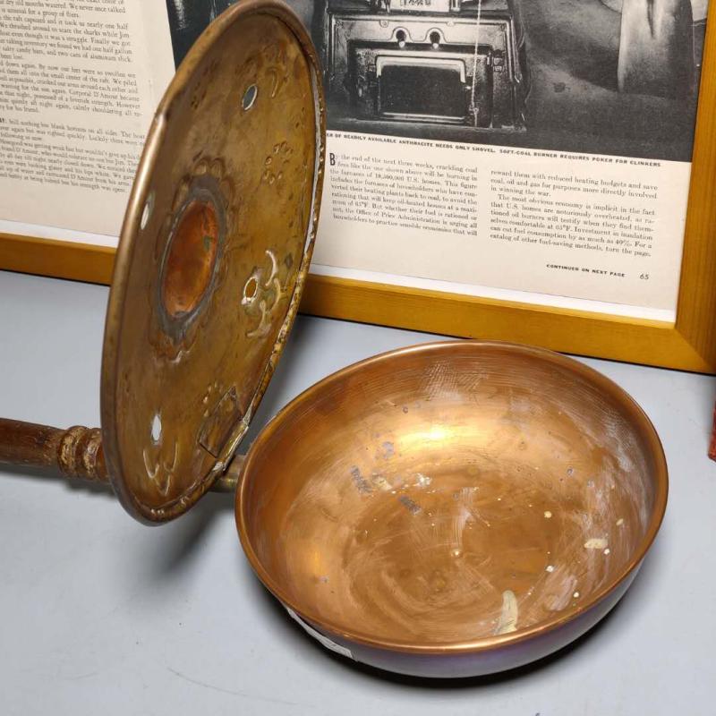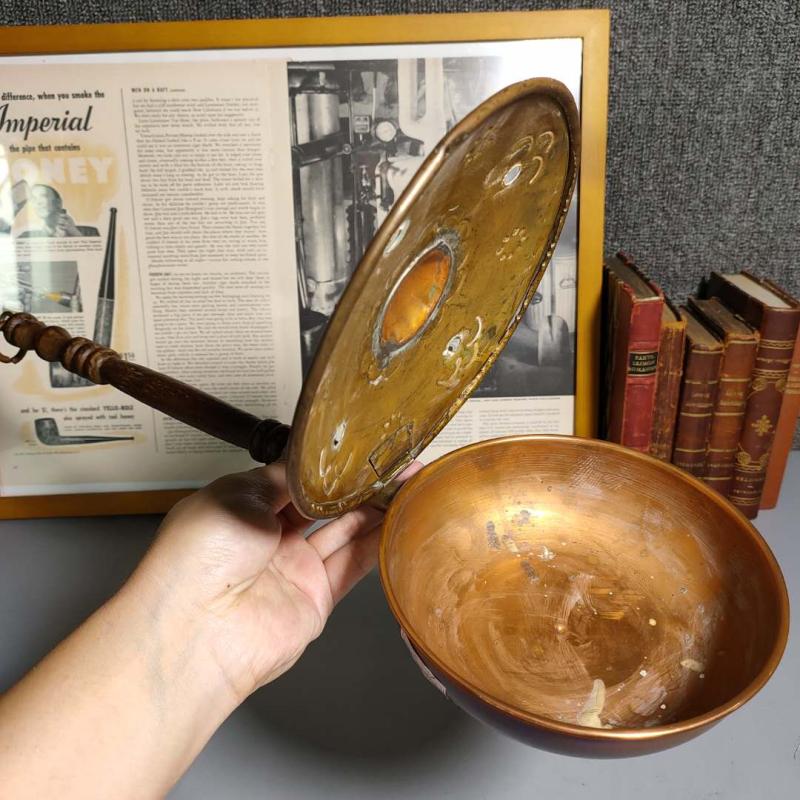 19th-century Western antique bronze small with lid copper pan pizza pancake pan with wooden handle old objects
