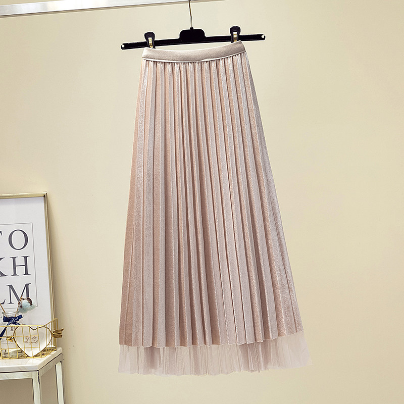 Two-sided gold velvet mesh skirt women's autumn and winter pleated skirt medium long high waist A- line skirt vintage gauze skirt