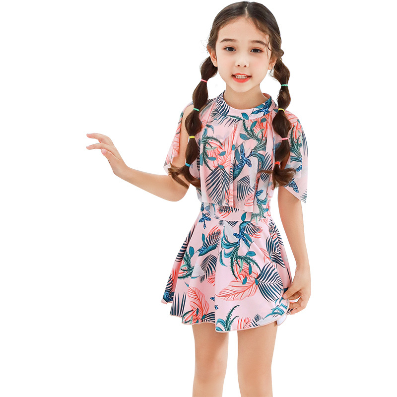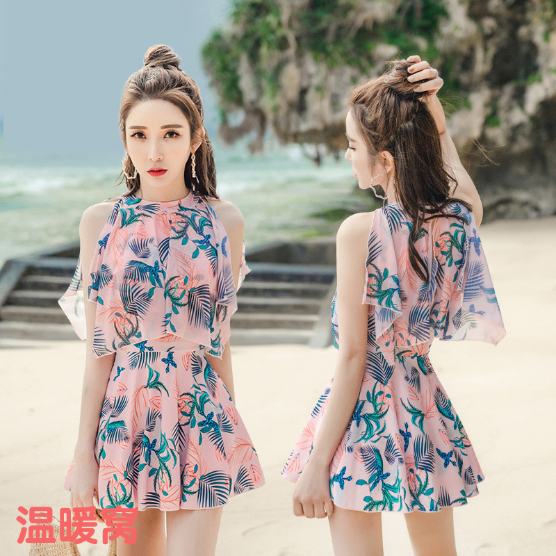 A family of three fashion ruffled conservative boxer pants one-piece dress mother-daughter swimsuit beach spa swimwear