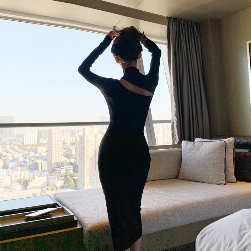Black semi-high collar knitted hip dress women's autumn and winter waist slimming knee-length bottoming dress socialite temperament