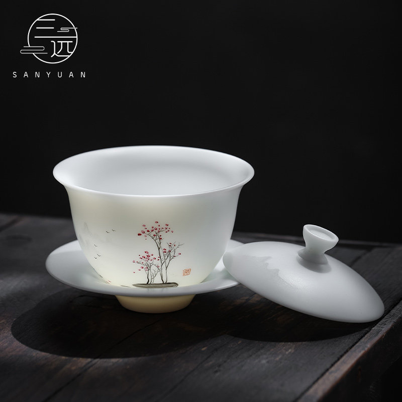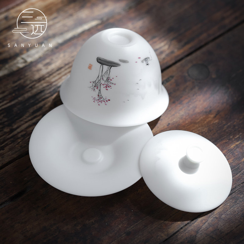 Three-far hand painted Yieshan Companion Water Goat Grease Jade White Porcelain Three-only Bowl High-end Utiliti Tea Bowl Tea Bowl Tea Bowl Cup Cup Home