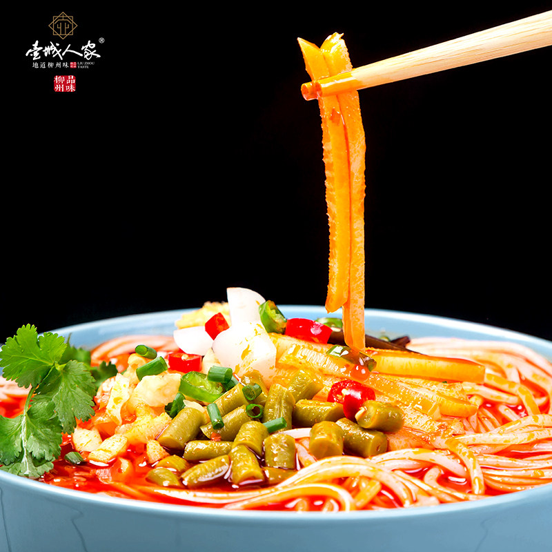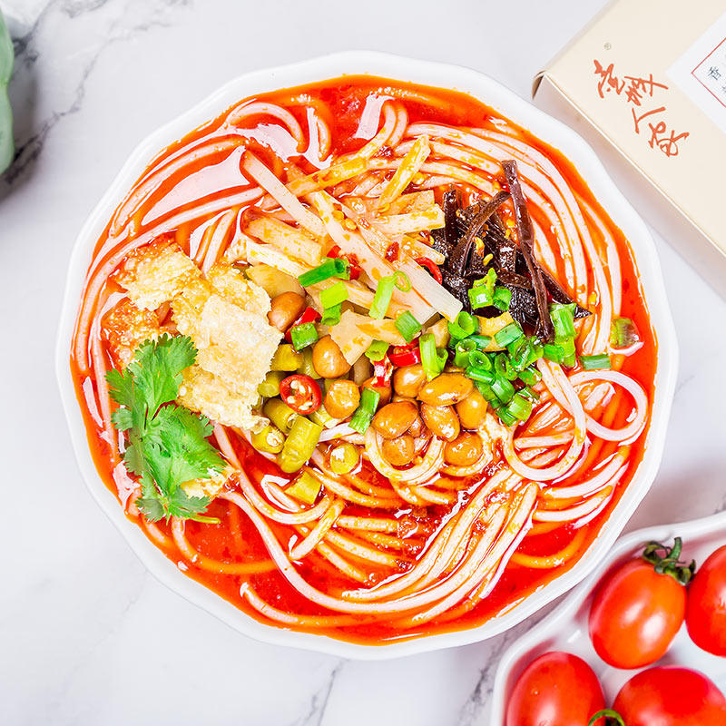 Prepared dry rice noodles, soup, sour bamboo shoots, carrots, dried sour beans, yuba, peanuts, chili oil, sour vinegar, dehydrated fungus