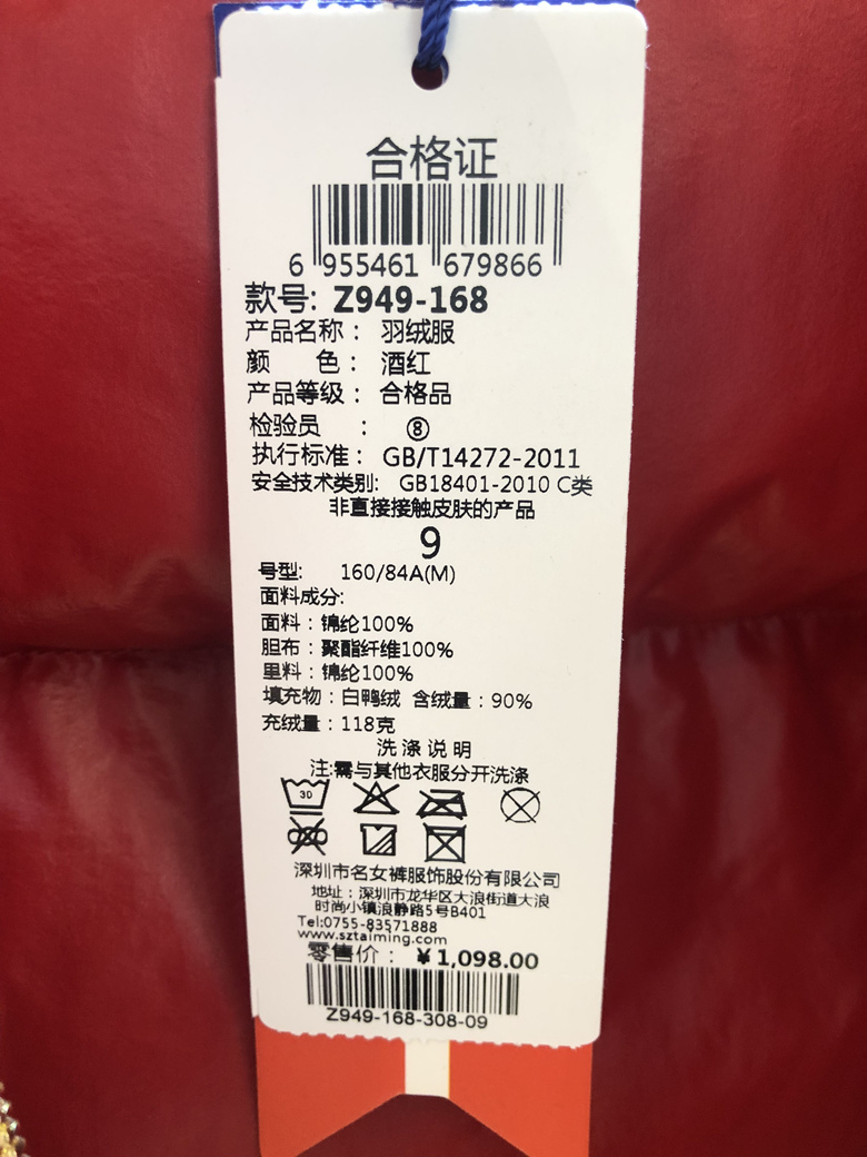 Ming women's pants Z949-168 counter 2019 winter down jacket white duck down short Taiwan Mingming
