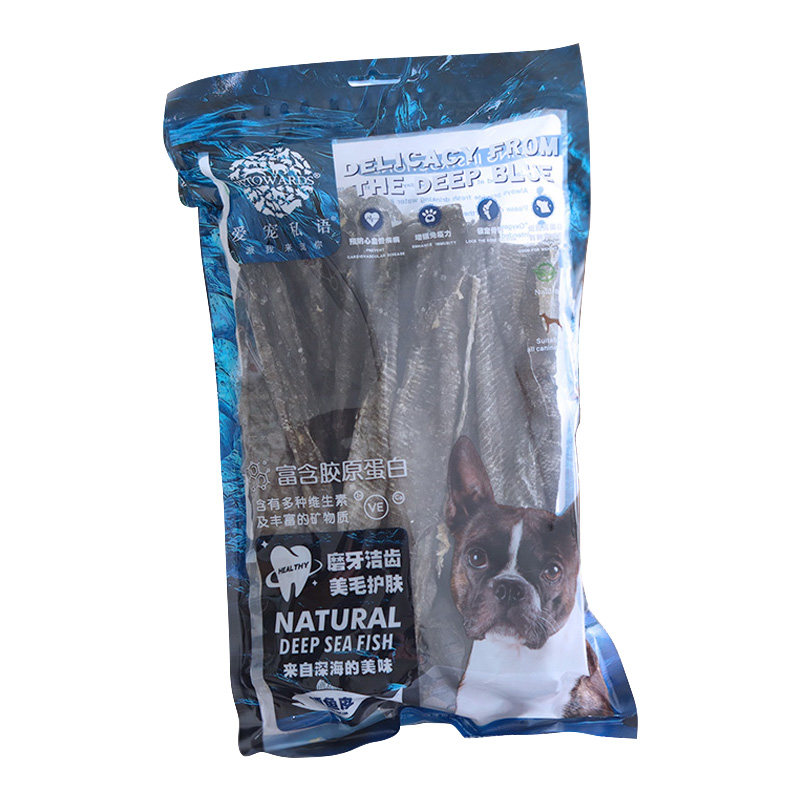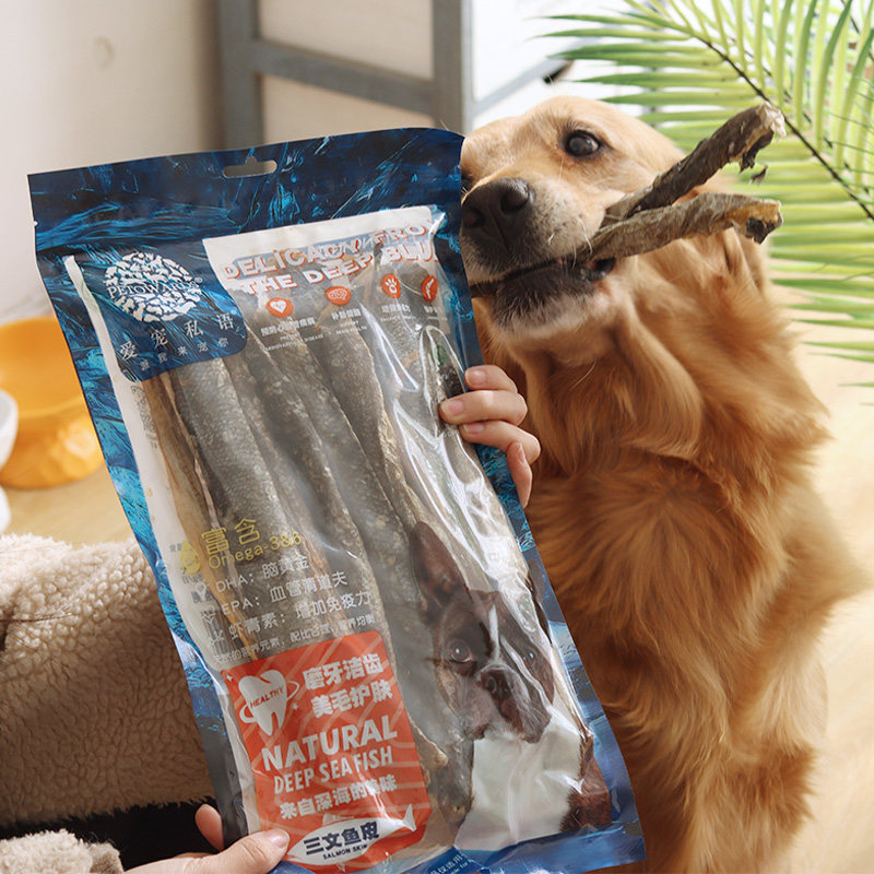 Dog fish skin snack air dry cod skin salmon skin grinded tooth stick to bite and cod snack pack 150g