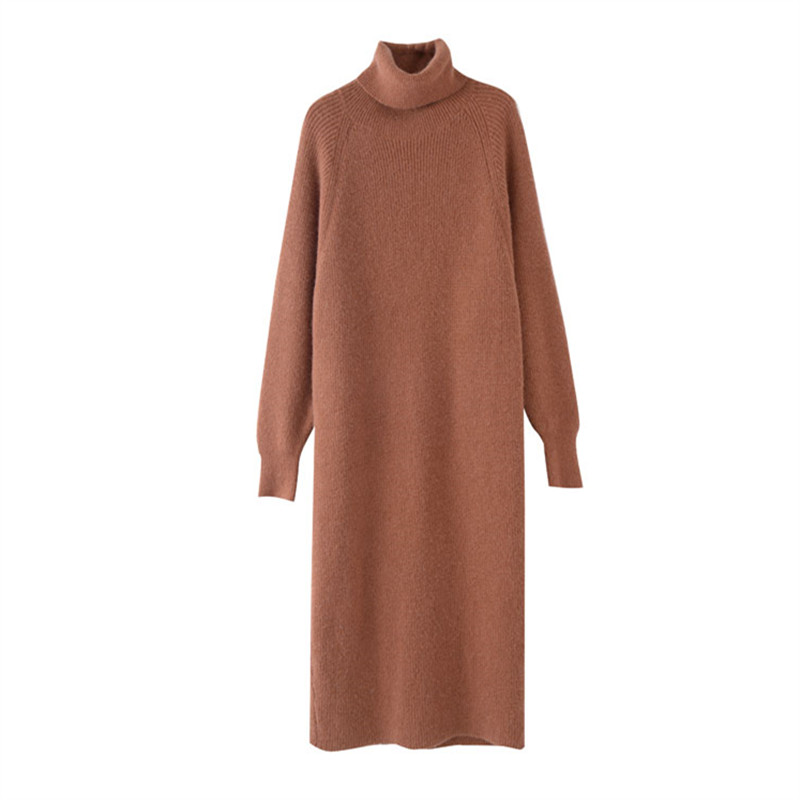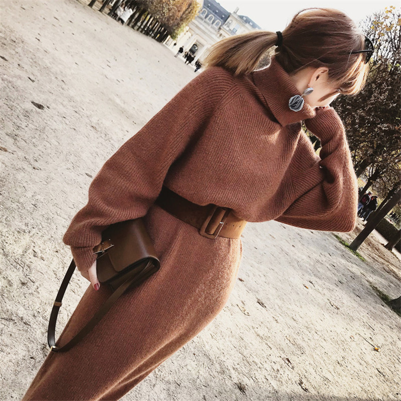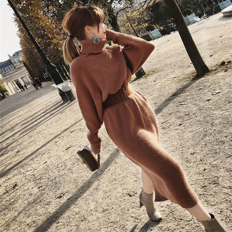 Lazy wind over the knee long knitted dress loose thickened high collar pullover waist long sleeves bottoming sweater skirt women