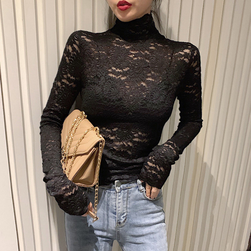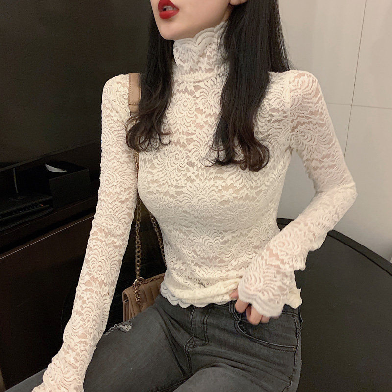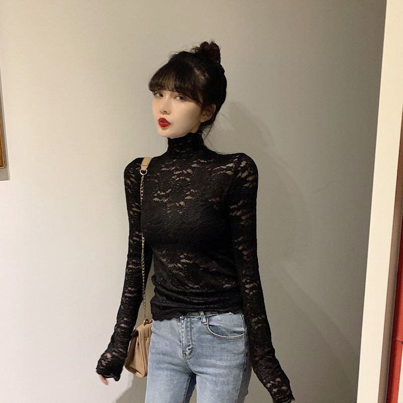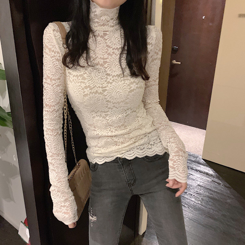 Semi-high collar lace base shirt women's inner match 2021 autumn and winter new Foreign school T-shirt Korean version of the wild top women's fashion