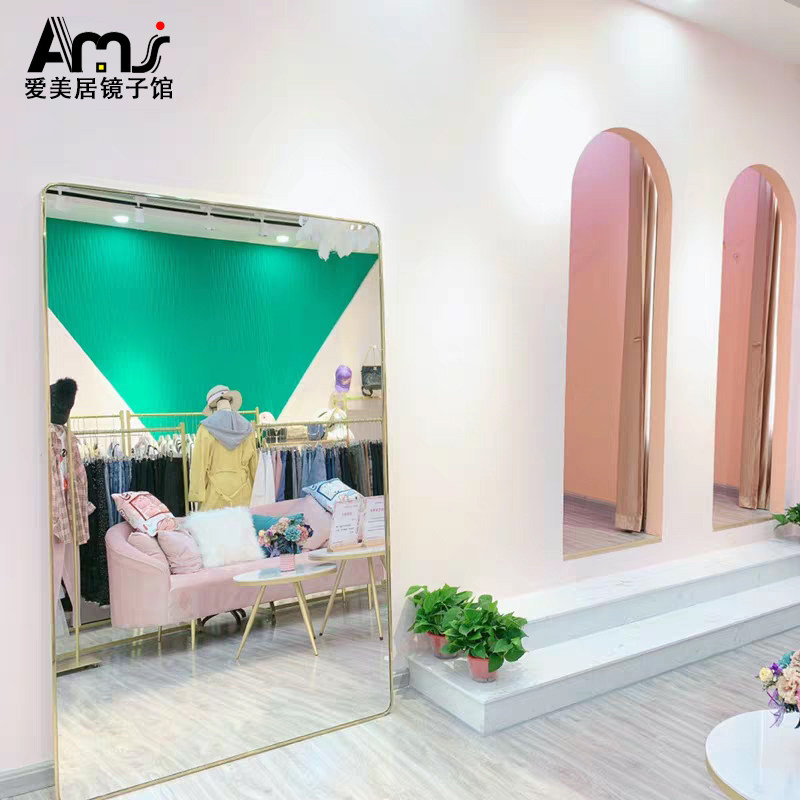 Light luxury clothing store fitting mirror round arc stainless steel floor mirror full body mirror super white thin mirror wall hanging mirror customization