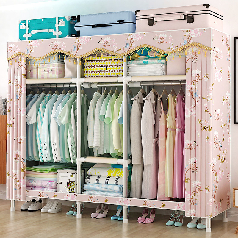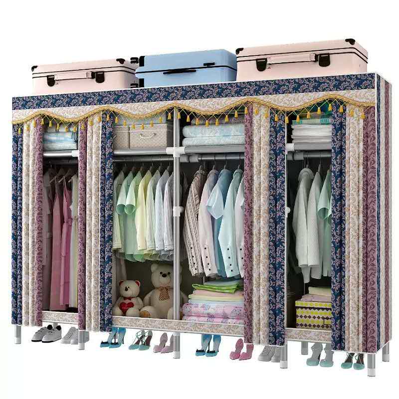 Household simple cloth wardrobe steel pipe bold reinforcement thickened all steel frame curtain type stainless single double assembled wardrobe