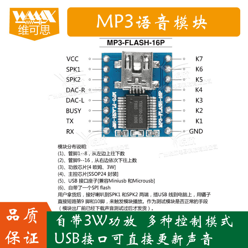 Serial port MP3 voice module, USB can directly replace the sound, serial port and button control play sound