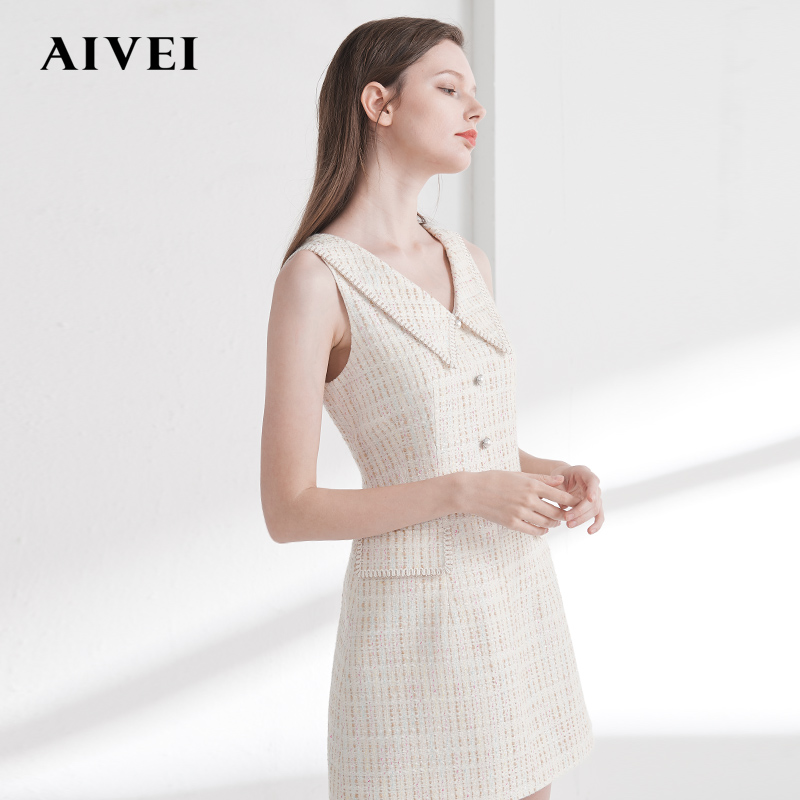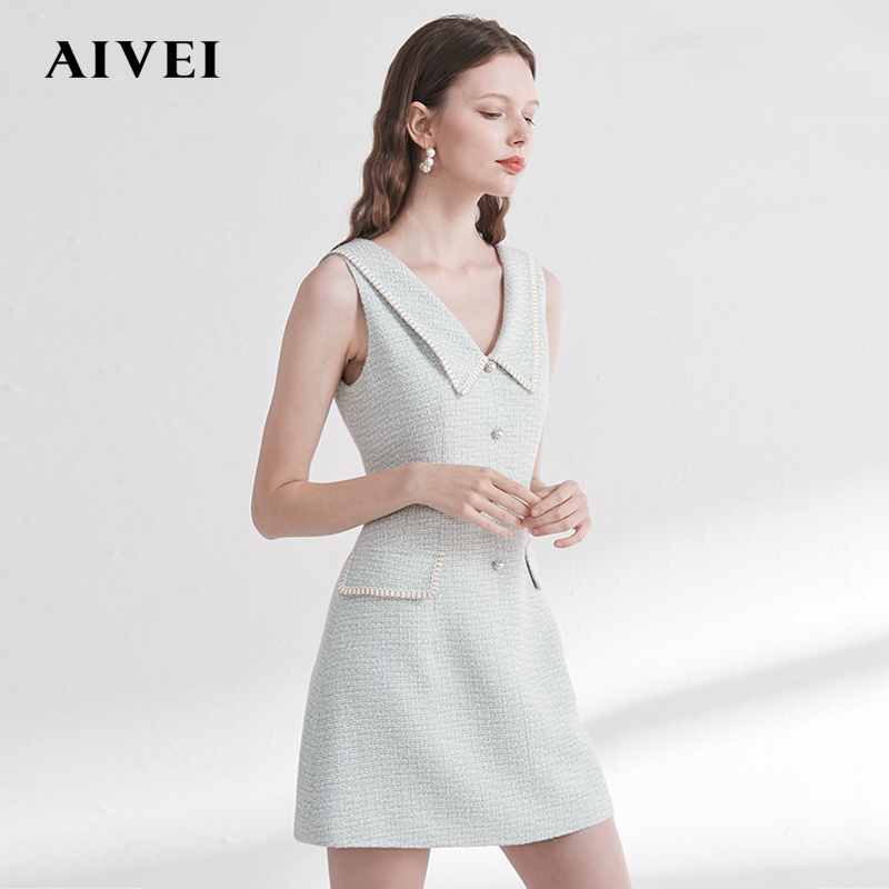 AIVEI Hyeon Ai Weiwei Spring new V collar pearl button to collect waist small fragrant wind sleeveless foreign dress M0160038
