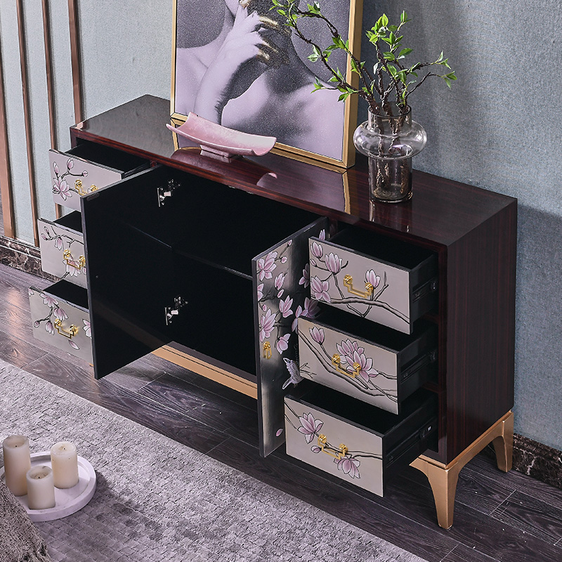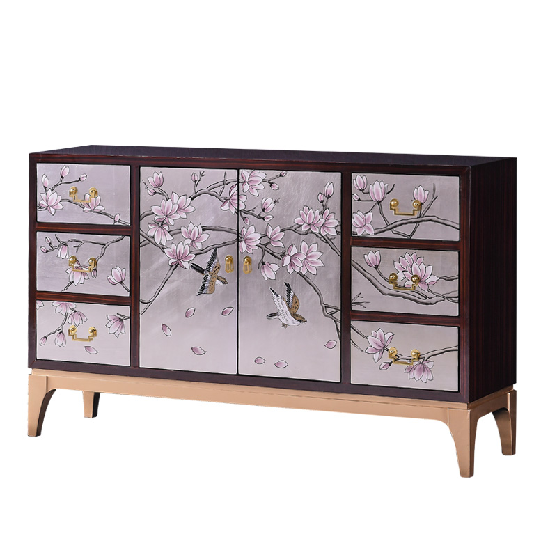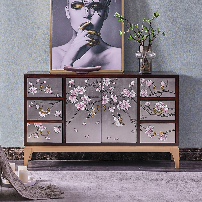 New Chinese style porch cabinet piano paint hand-painted living room compartment cabinet light luxury ebony wine cabinet silver foil screen hall cabinet