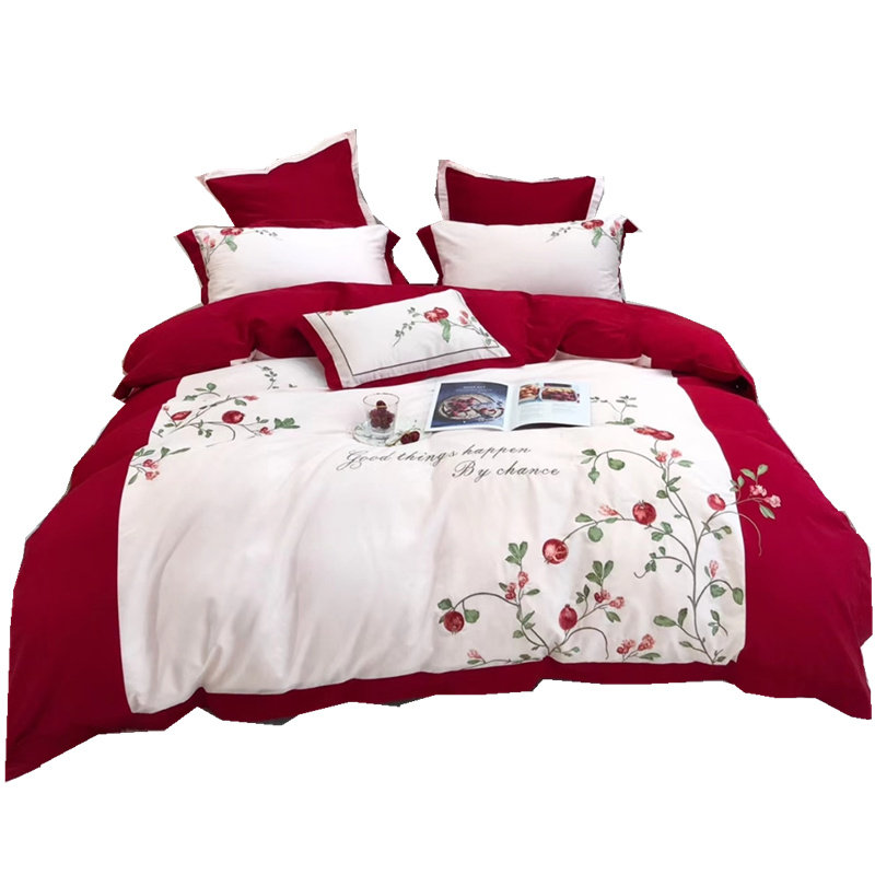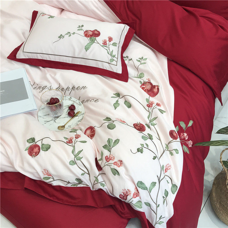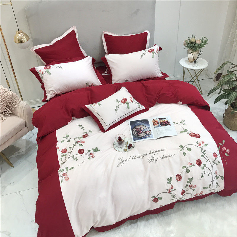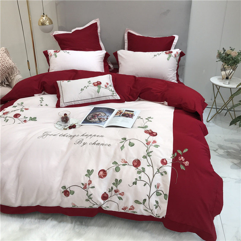 American-style embroidery pomegranate flower 60 count long-staple cotton four-piece set cotton pure cotton idyllic red bedding home textile