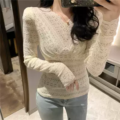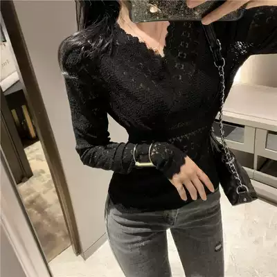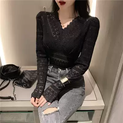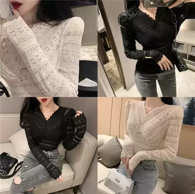Spring and autumn new body lace bottoming shirt women's long-sleeved mesh sexy hollow small shirt Western style V-neck stretch top