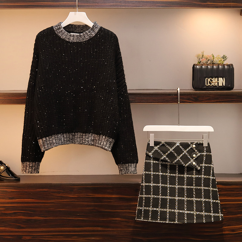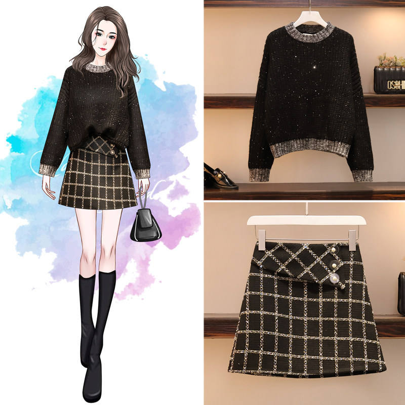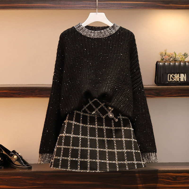 Large size women's clothing autumn and winter new fat sister 2019 cover meat, reduce age and show thin foreign pie sweater two-piece suit skirt