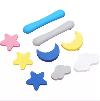 Yellow small star Yellow Big Star Blue small star Blue Big Star pink small white cloud big white cloud small black cloud big black cloud yellow moon blue moon red strip blue long green strip gray strip