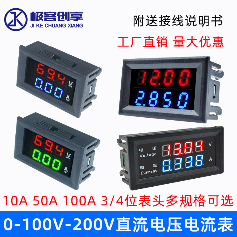 DC0-100 200V 10A dual display digital current voltmeter LED ammeter DC digital voltmeter head