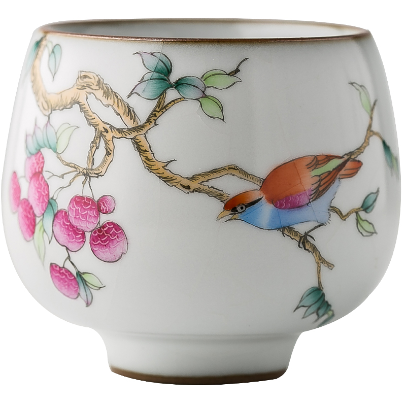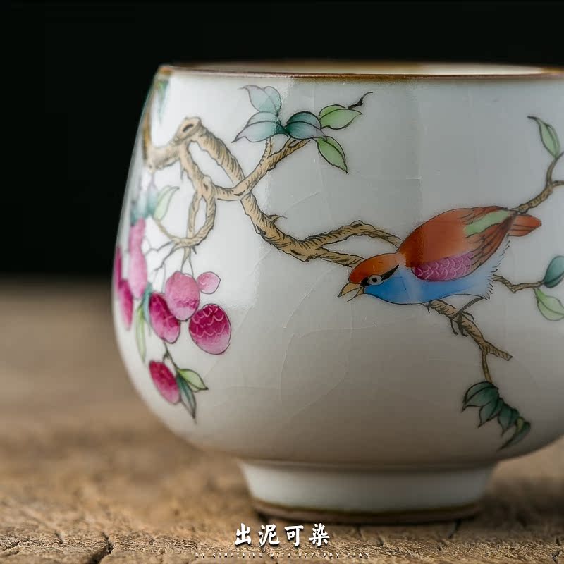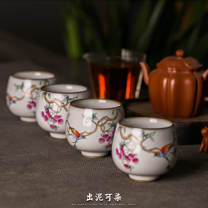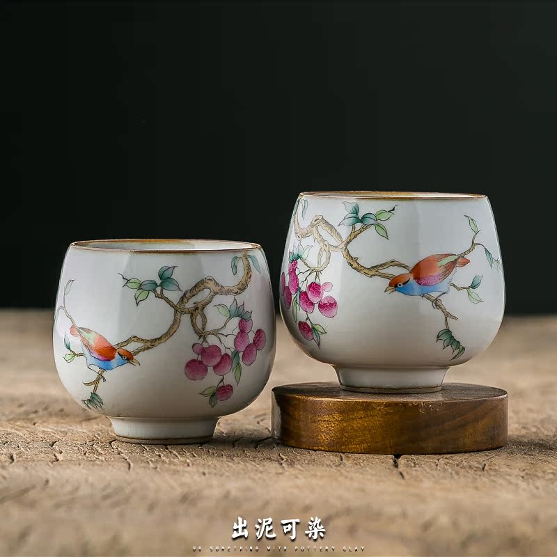Out of the clay can be dyed hand-painted Ru Kiln flower and bird cup, Jingdezhen ceramic Kung Fu tea set, sample tea cup, individual single cup, host cup
