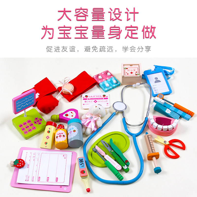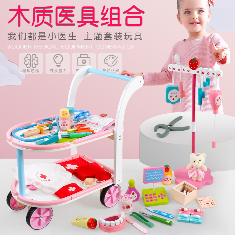Children's wooden doc kit girl baby nurse baby family medical cart toy injection hospital