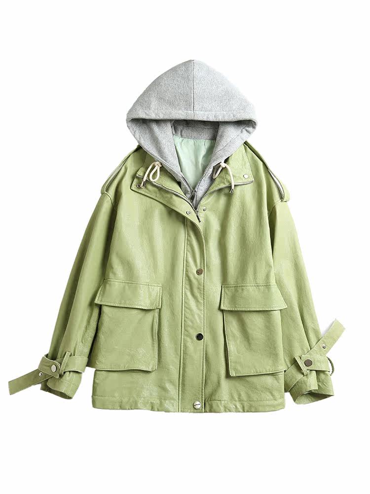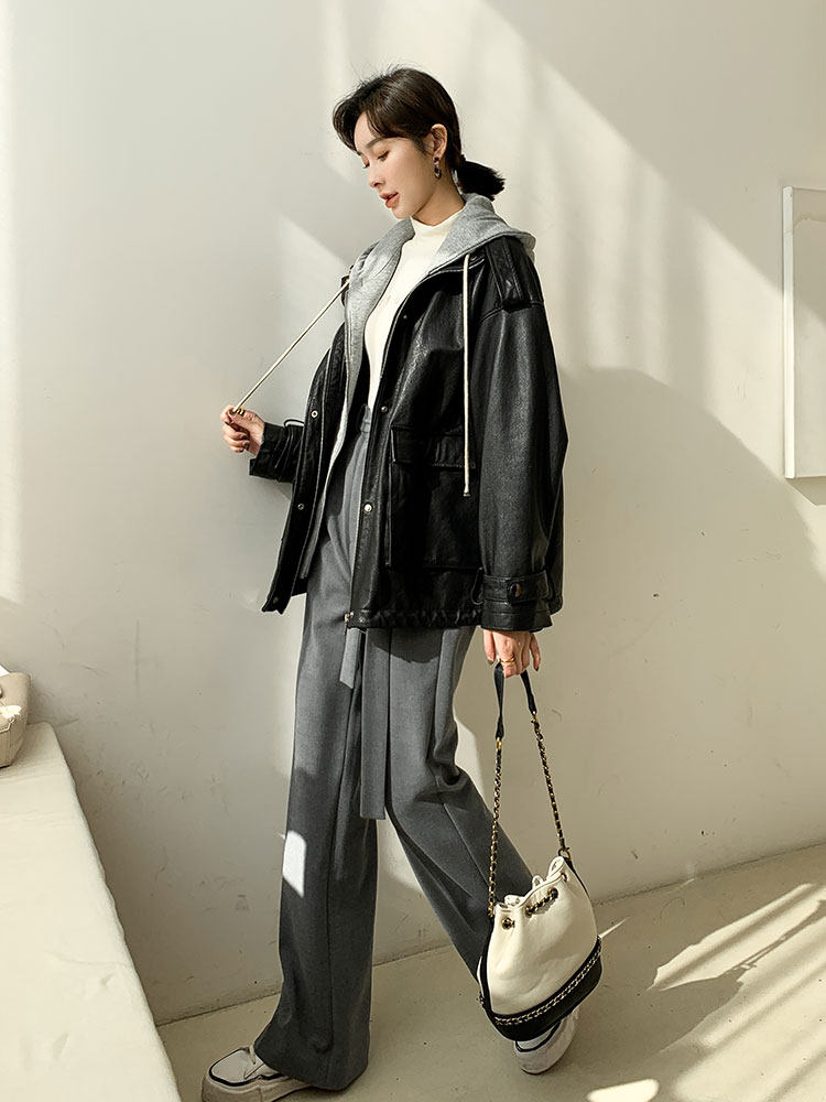 KC Home 2021 Autumn and Winter New Imported Vegetable Tanned Sheep Leather Genuine Leather Fake Two Pieces Loose Hooded Jacket