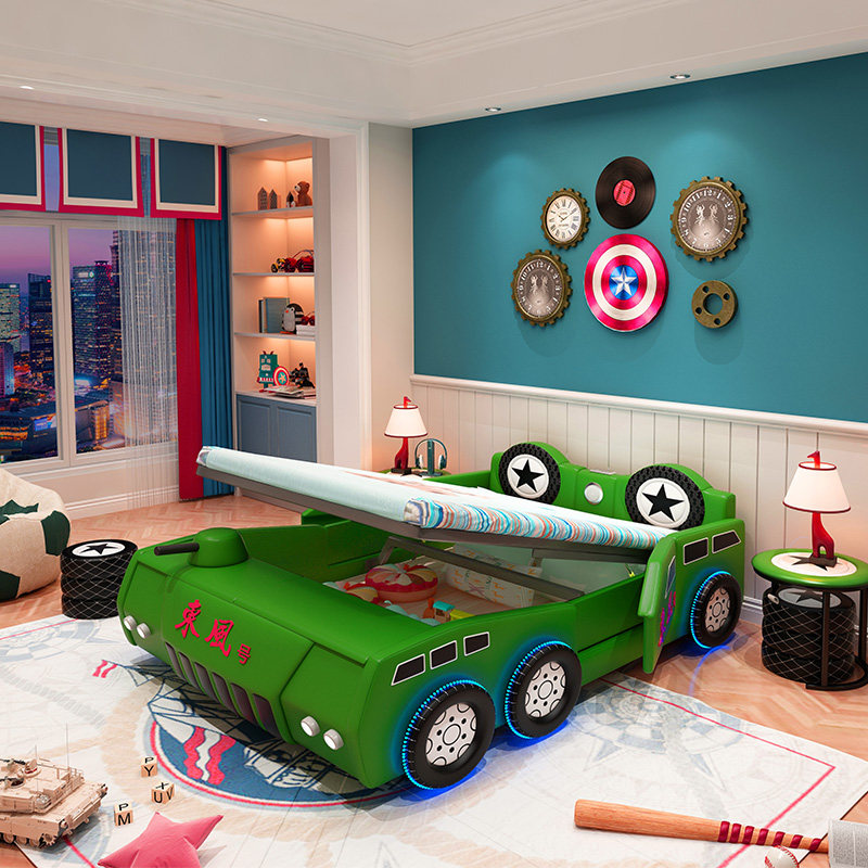 New multifunctional children's bed boy girl with guardrail cartoon car leather bed 15m creative tank bed