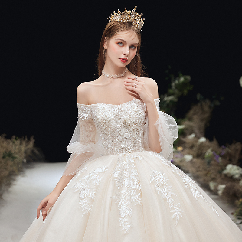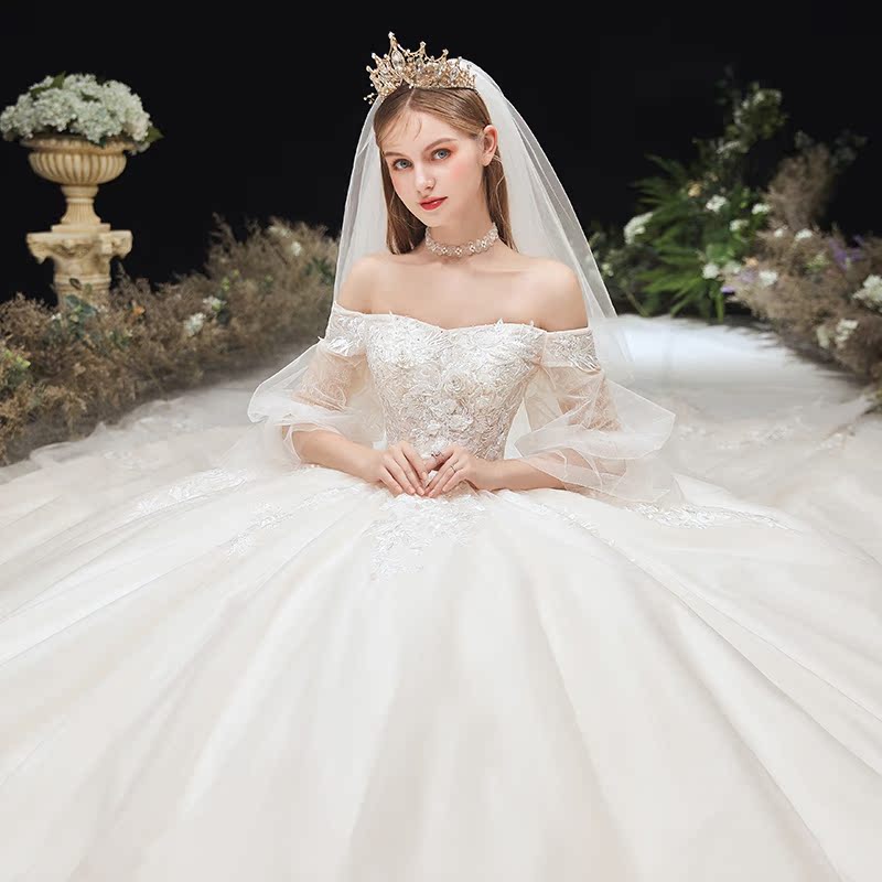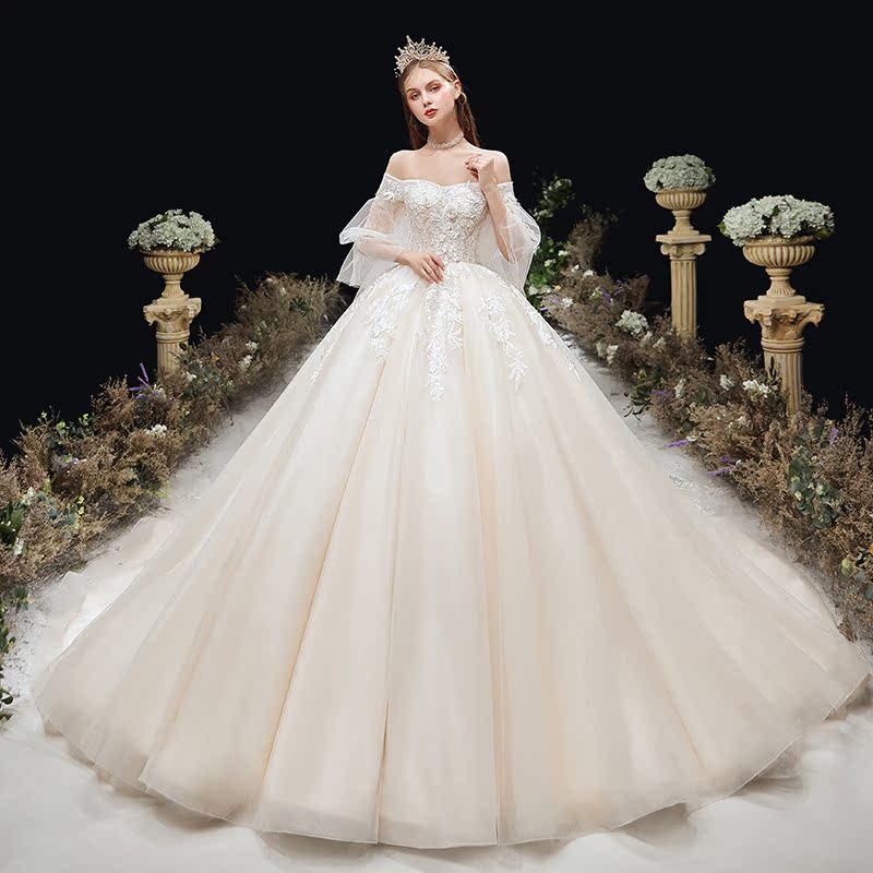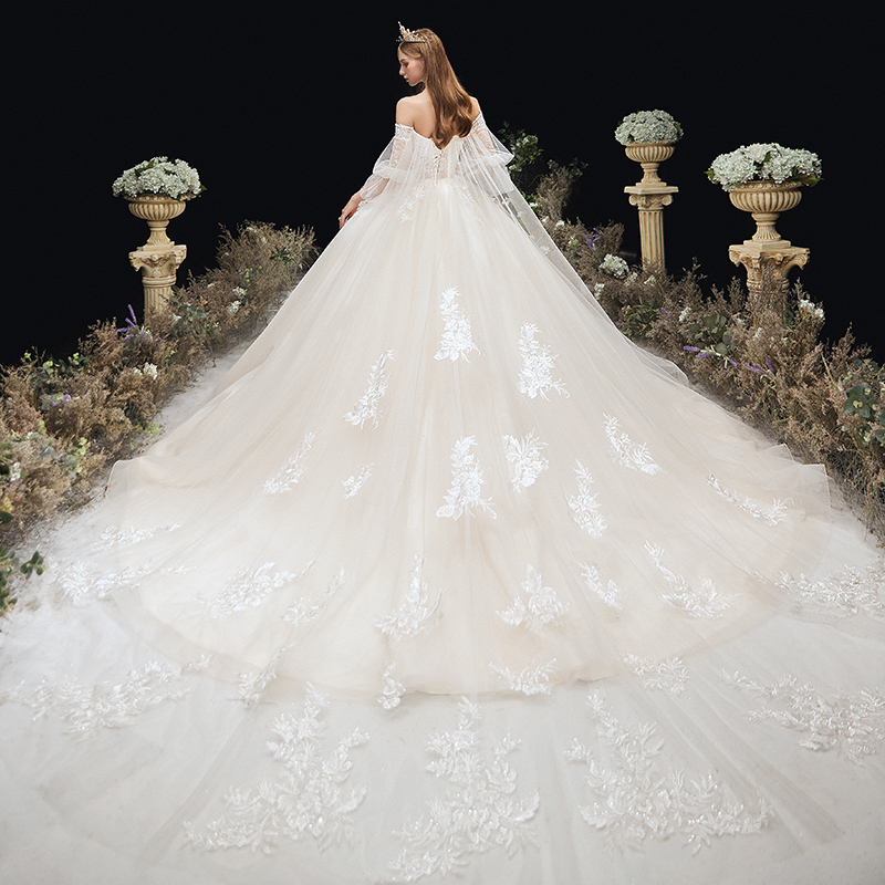 Word shoulder main wedding dress 2021 new bride forest temperament French starry sky long tail dream super fairy long-sleeved woman