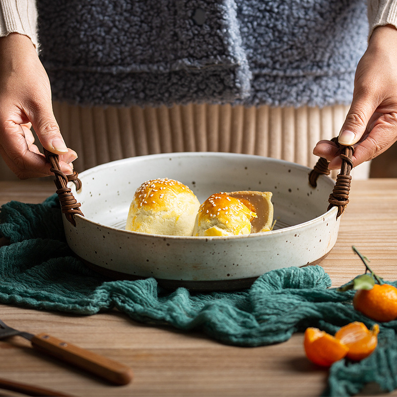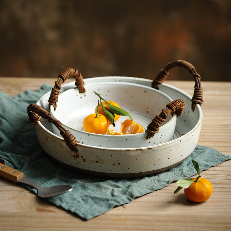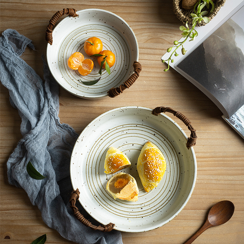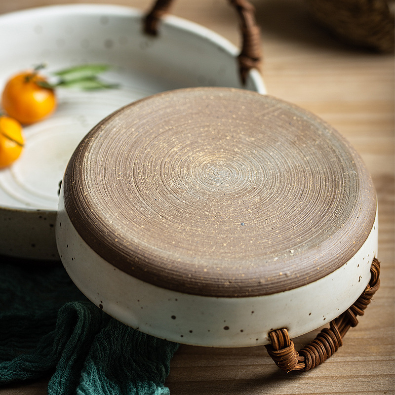 Japanese-style rough pottery hand-made plate hand-woven rattan double-ear basin soup bowl simple soup plate bowl retro bowl pot household fruit plate