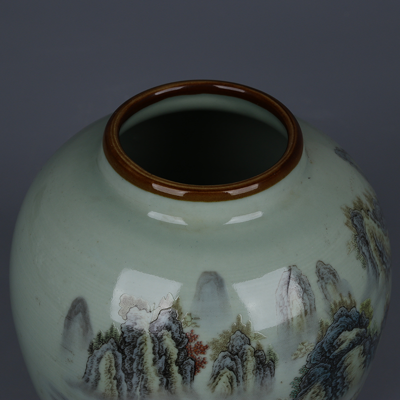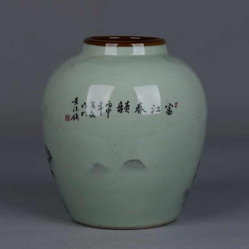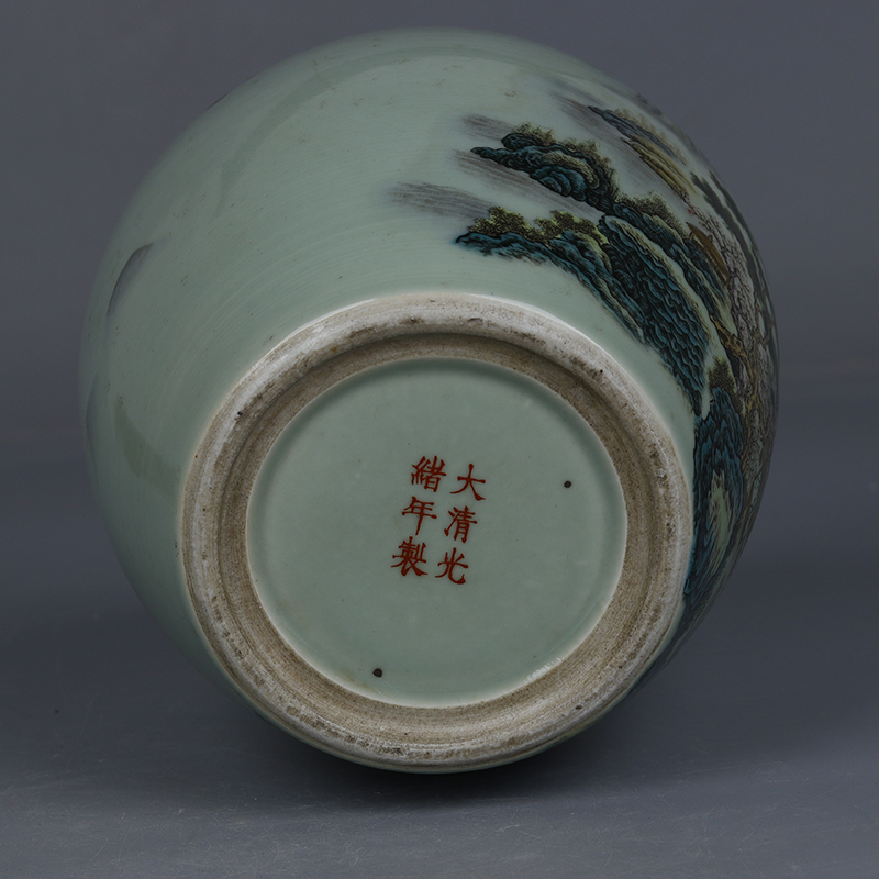 Qing Dynasty Guangxu year-made pastel Fujiang Spring Rhyme Landscape Pattern Bean green sauce Glazed mouth jar Antique porcelain Antique antique Antique Antique Antique Antique Antique Antique antique antique antique