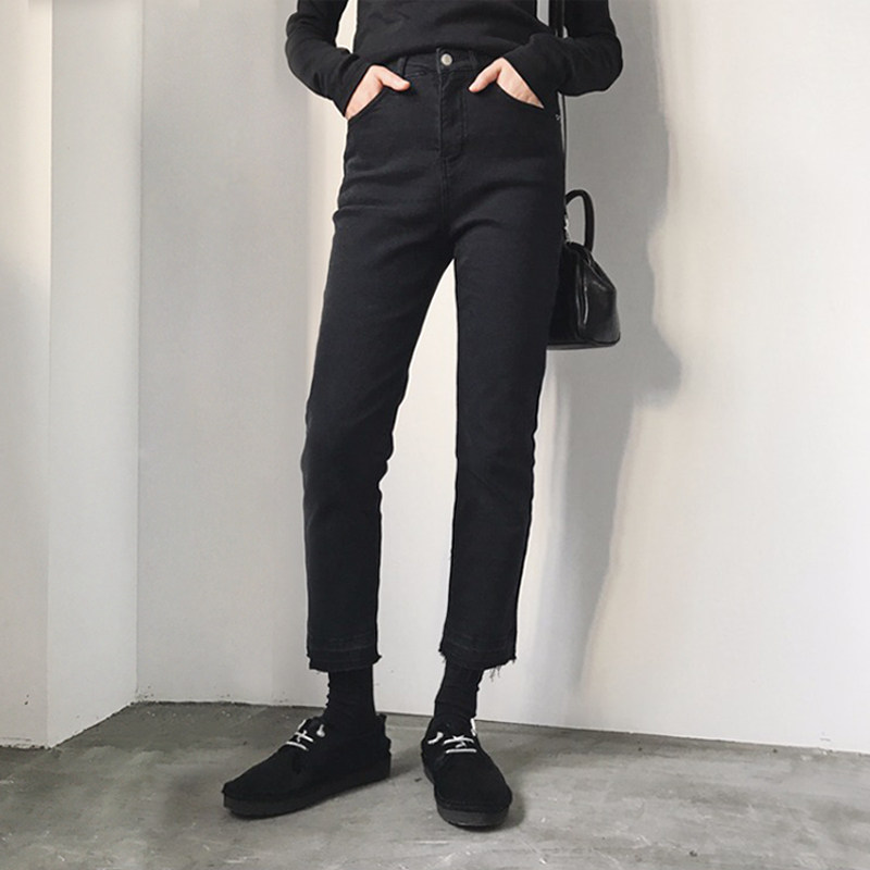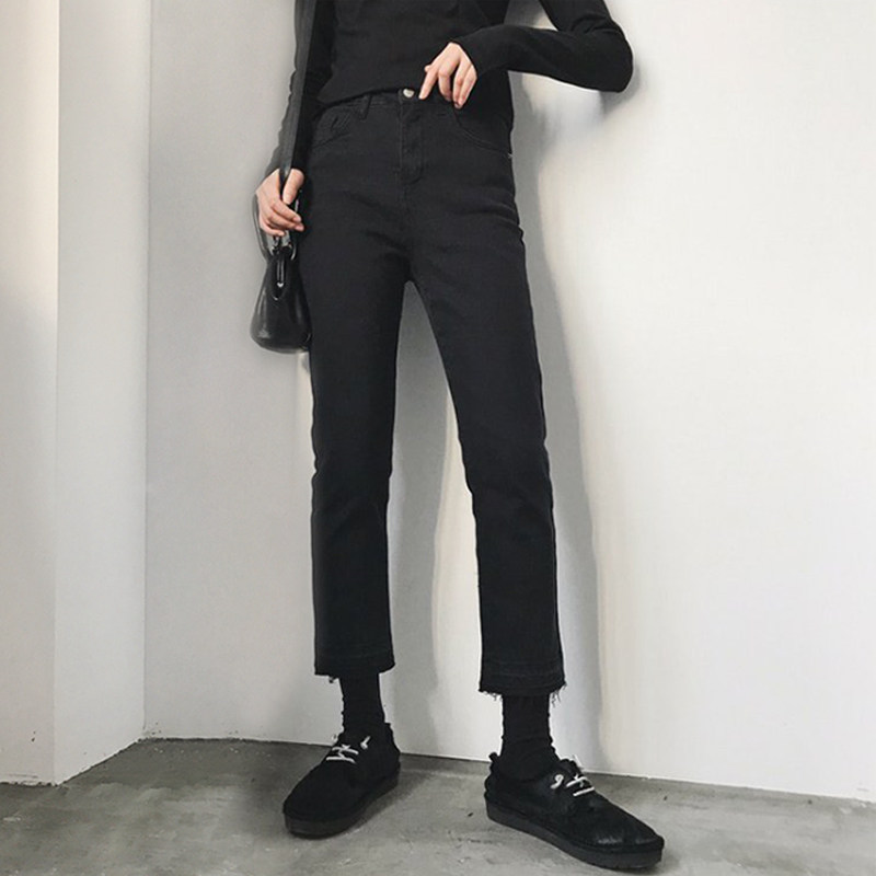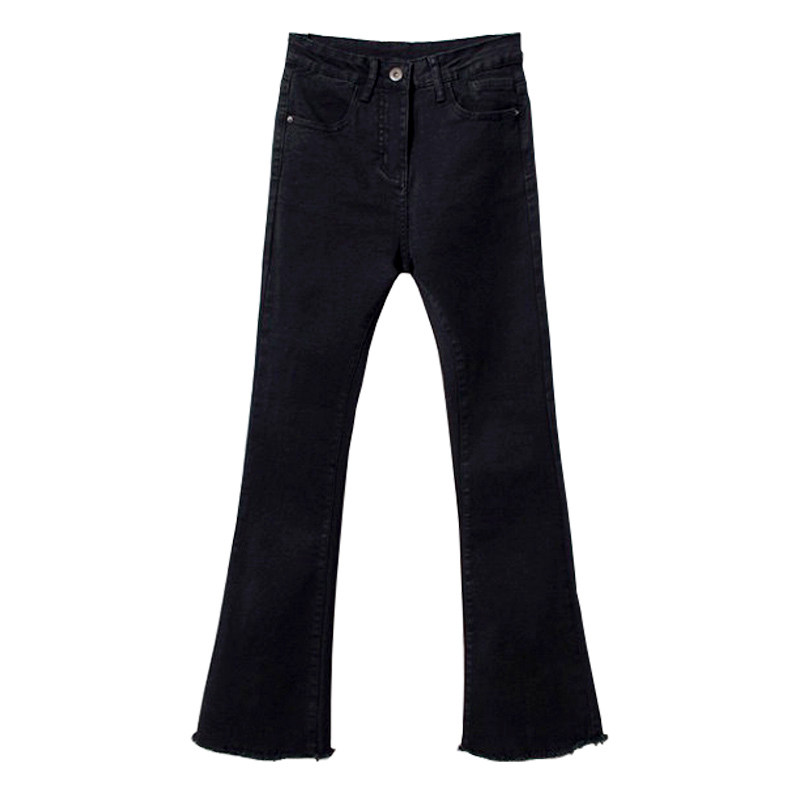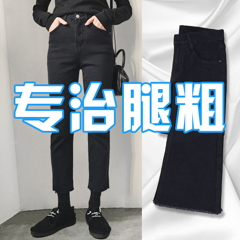 2019 autumn and winter black jeans women's cropped pants fringed raw edge high waist micro horn slim slim high elastic ins
