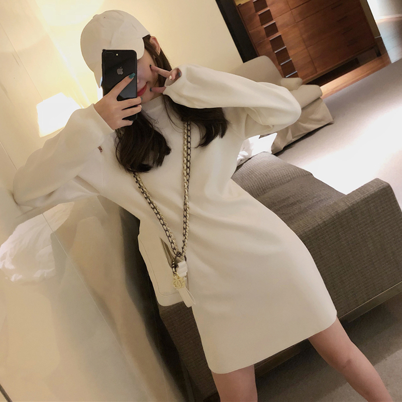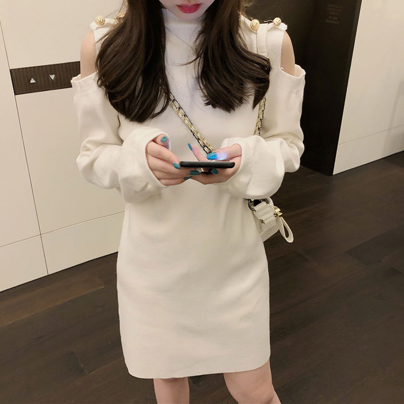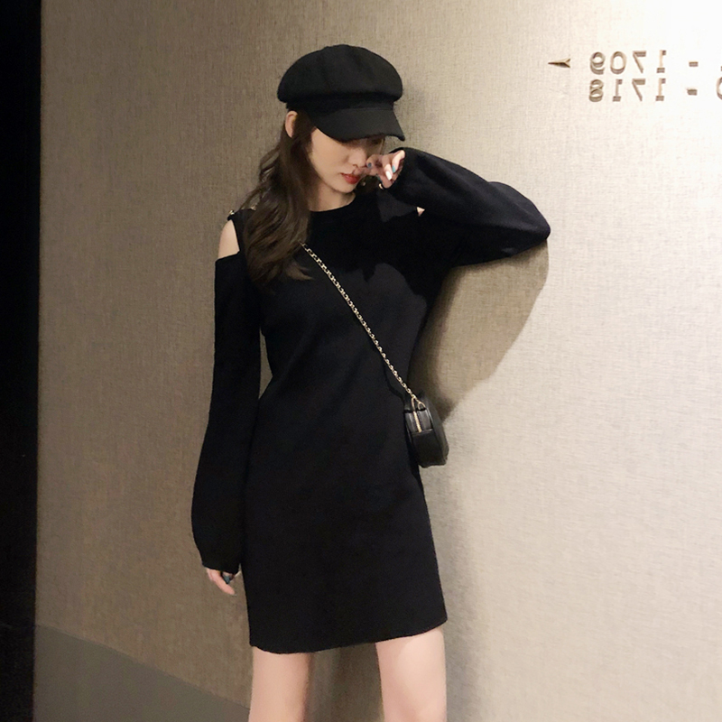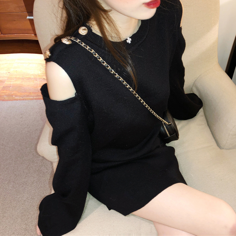 Autumn and winter temperament small and fragrant wind dew shoulder sweet and beautiful superfairy medium long version French style inner hitch bottom knit foreign dress