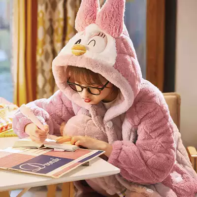 Pajamas women's autumn and winter three-layer padded padded flannel coral velvet home clothing cartoon hooded hot clothes