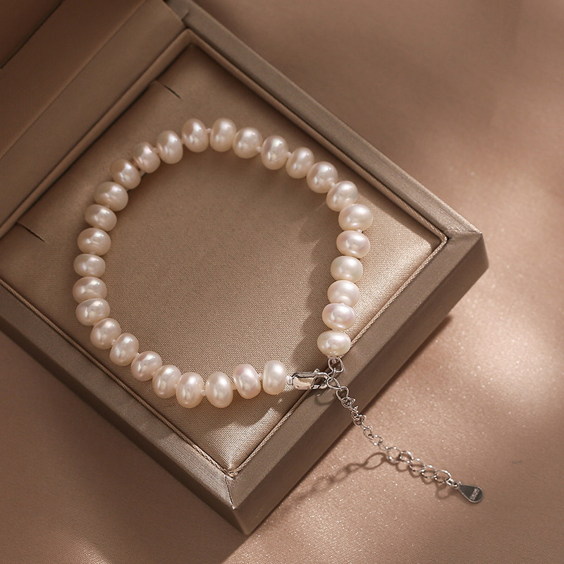 Natural freshwater pearl hand chisel near perfect circle 7mm strong light 925 sterling silver tail chain Japanese and Korean simple gift for mother