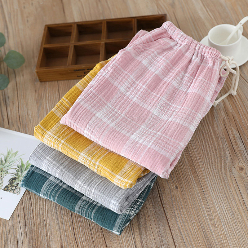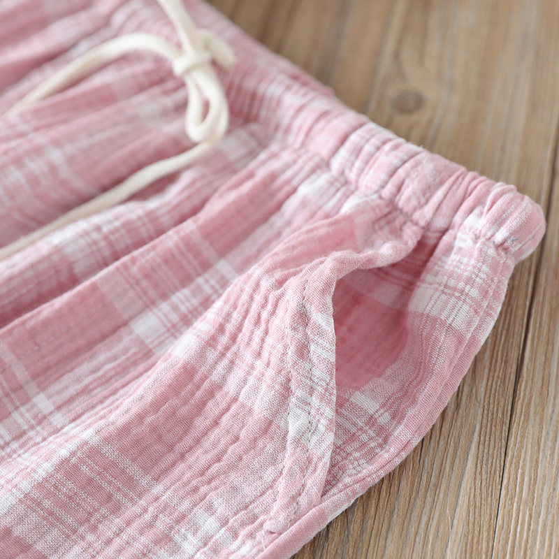 Day Ensemble Plaid Sleeping Pants Woman Pure Cotton Gauze Spring Summer Thin washed crepe cloth Home pants Long pants can be worn with large size
