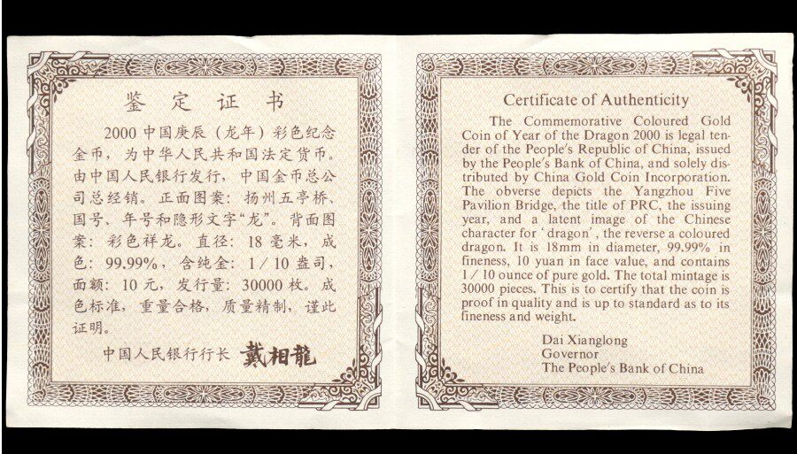 2000 Sheng Xiao Long Color gold coin 1 10 oz gold with certificate dragon year to commemorate gold coin color gold dragon