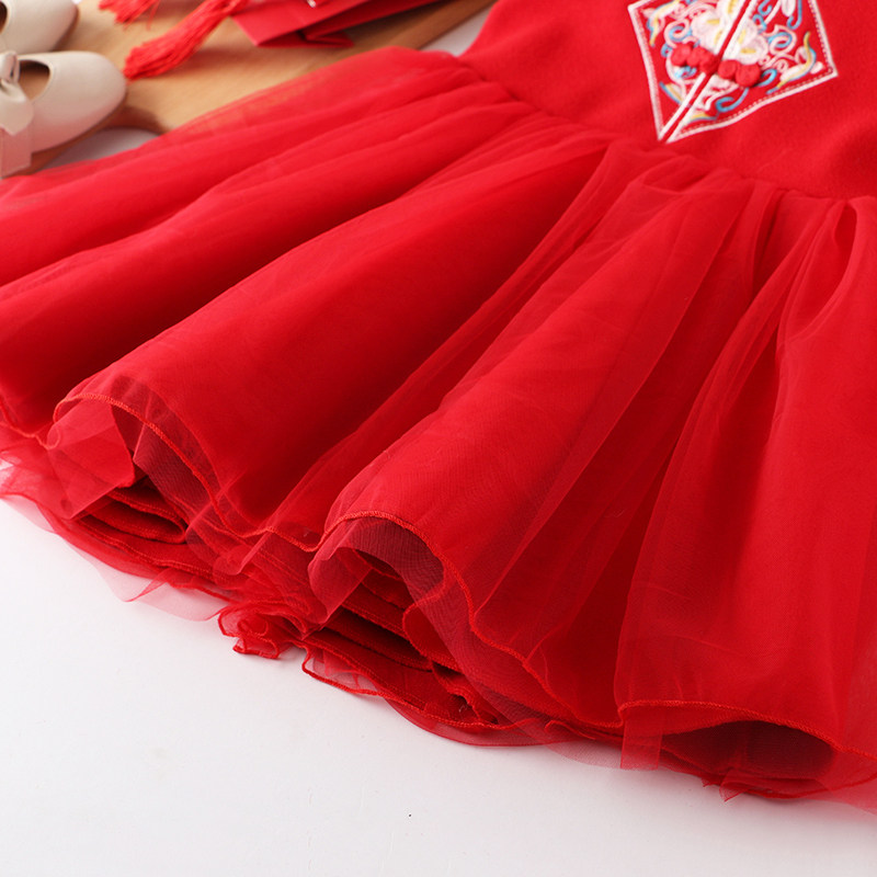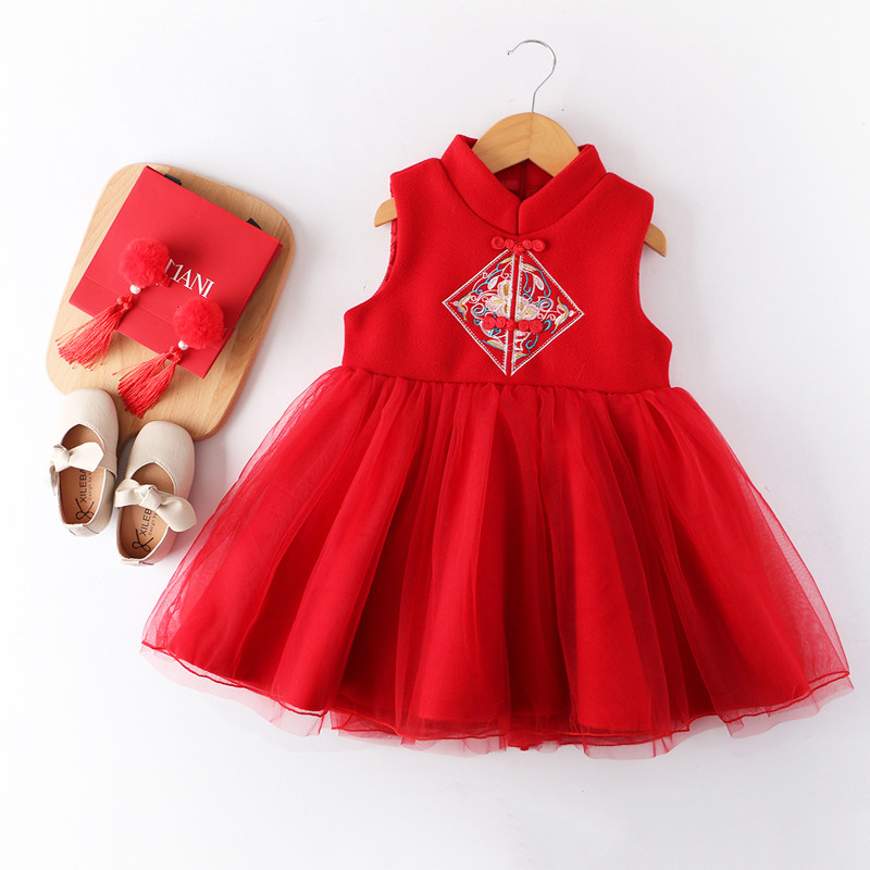 Girls dress autumn and winter thickened princess dress children winter dress red gauze dress Chinese style cheongsam woolen vest dress