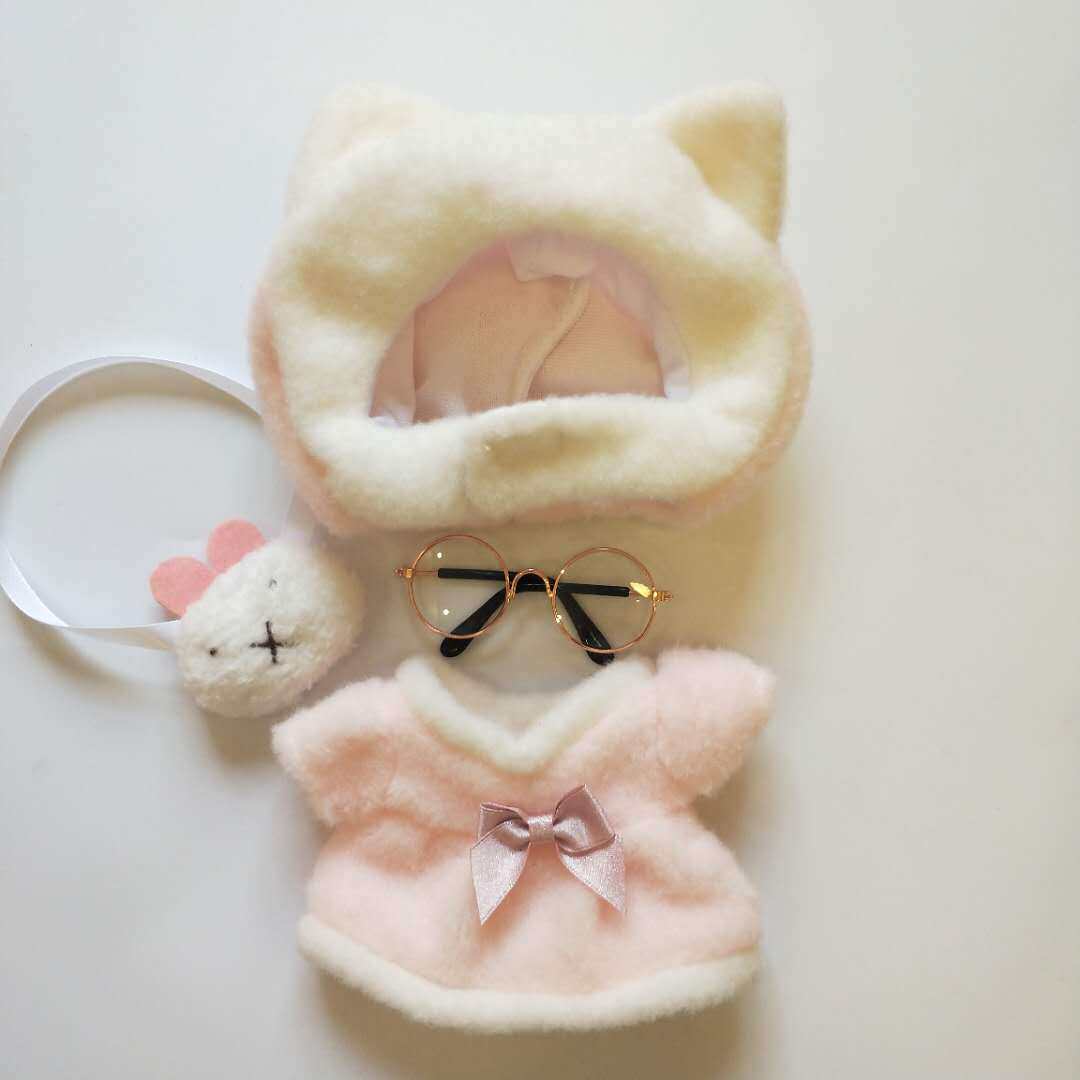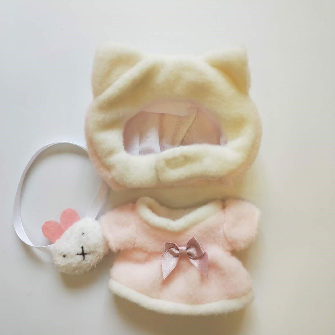 Cat hood, hat, pink and white skirt, cat hood, pink and white skirt, cat hood, pink skirt, bunny bag, cat hood, pink skirt, glasses, bunny bag, white outing bag, brown outing bag, pink bedding five pieces, yellow bedding five
