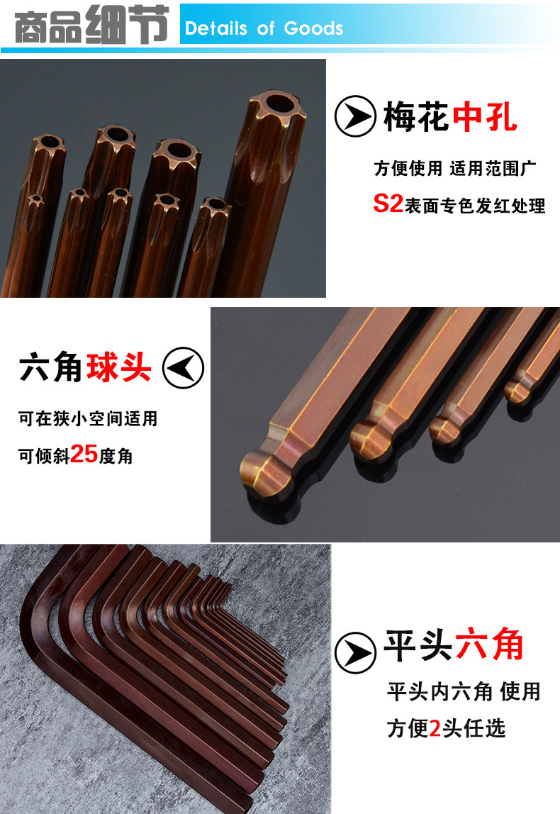 8 pieces of flat head-head JTJ ball head wrench 7 pieces 1 5-6mm (007D) flat head wrench 7 pieces 0 7-3mm (037H) ball head wrench 9 pieces of sleeve 1