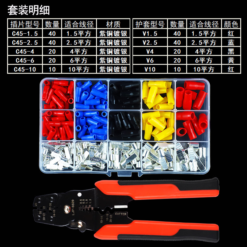 Set of crimping pliers set without crimping pliers set with new crimping pliers 1.5 square meters (100 pieces), 2.5 square meters (100 pieces), 4 square meters (100 pieces), 6 square meters (50 pieces), 10 square meters (50 pieces), 16 square meters (20 pieces), 25 square meters (20 pieces), 35 square meters (10 pieces), 50 square meters (10 pieces), 1.5 square sheaths (100 pieces), 2.5 square sheaths (100 pieces), 4 square sheaths (100 pieces), 6 square sheaths (100 pieces), 10 square sheaths (100 pieces), 16 square sheaths (50 pieces), 25 square sheaths (50 pieces), 35 square sheaths (20 pieces), 50 square sheaths (20 pieces)