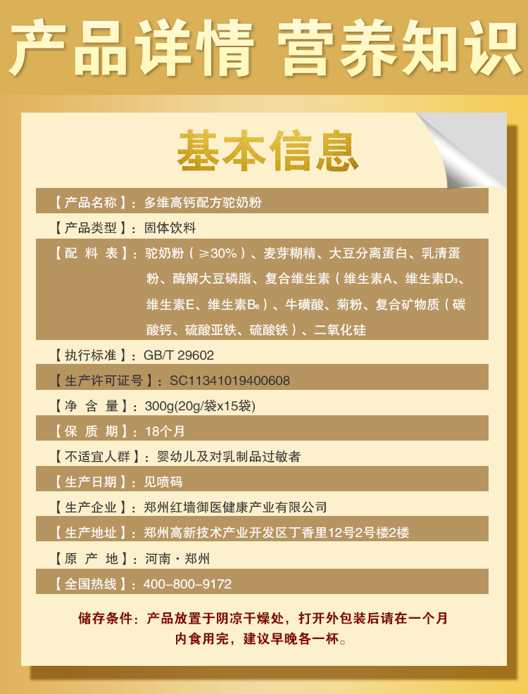Camel powder (≥ 3 0%) malt Burnt Essence Soy Isolated Protein Whey Protein Powder Zymes Soy Phospholipid Complex Vitamin Taurine Complex Minerals, etc.
