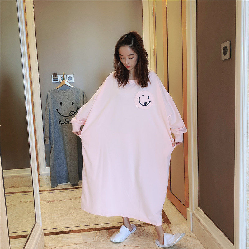 Spring and autumn long over-the-knee nightdress women's terry cotton sweet smiling face pajamas large size fat mm200 catties home service