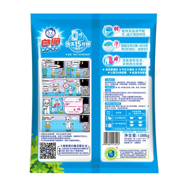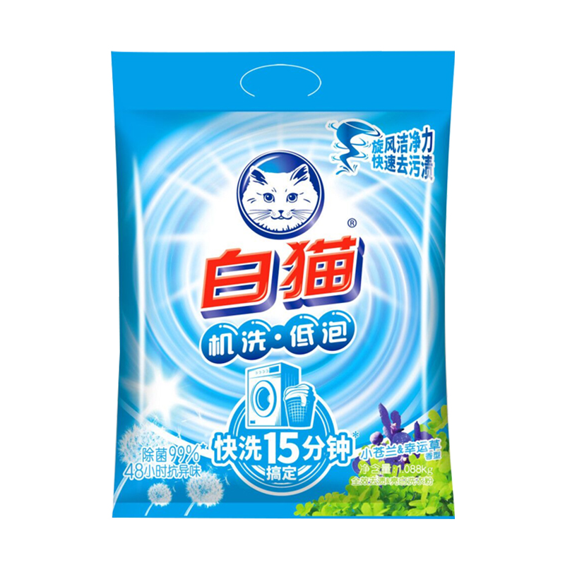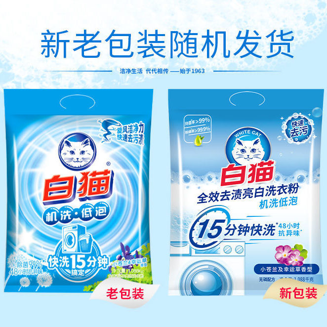 White cat phosphorus-free laundry powder degerming and anti-odor bag household official machine wash to remove stains bright white 1 088kg