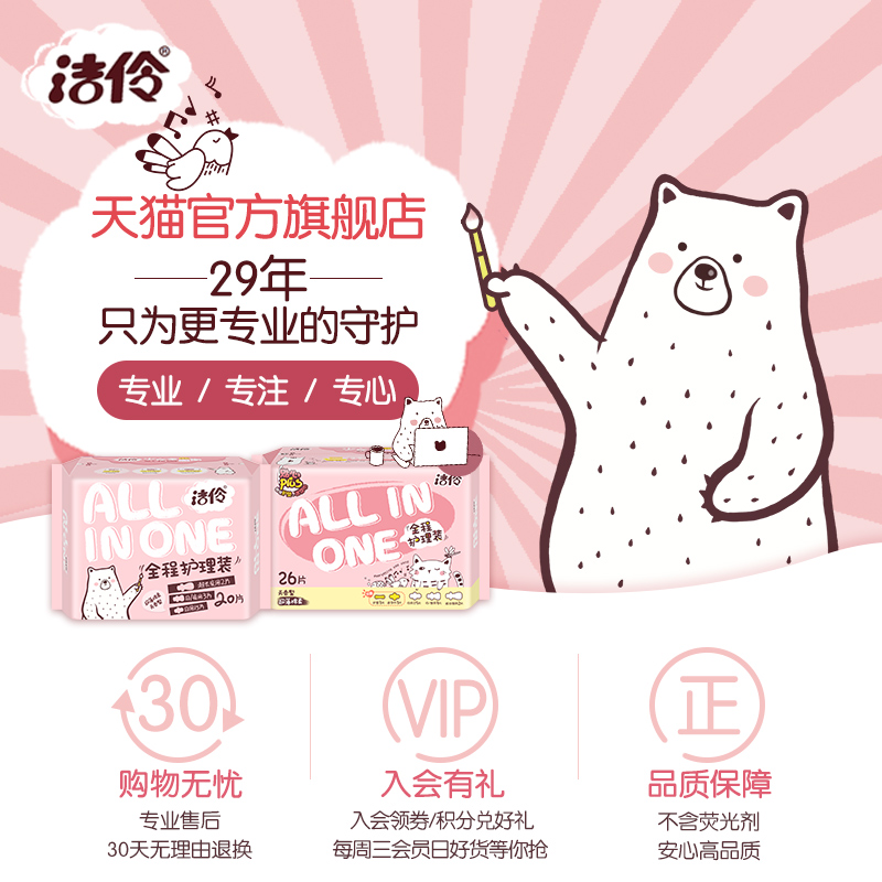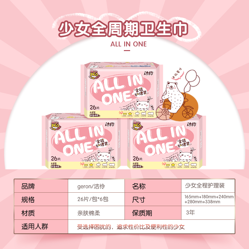 Jieling girl full care sanitary cotton cotton soft skin-friendly 6 packs of day and night mini pads a total of 156 pieces