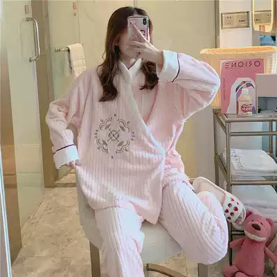 Hot Chinese style ~ pregnant women's pajamas autumn and winter thickened velvet post-natal coral fleece nursing set home moon suit