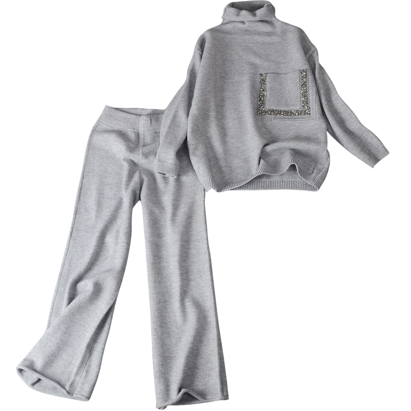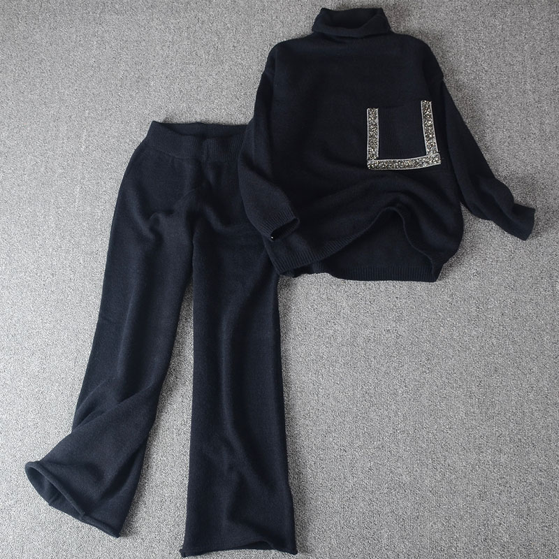 European station heap collar thickened cashmere sweater wide-leg knitted suit women's autumn and winter loose foreign style fashion two-piece set