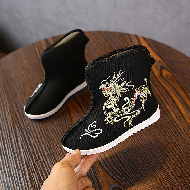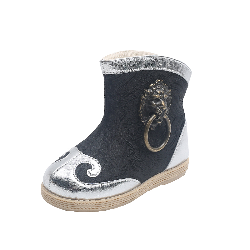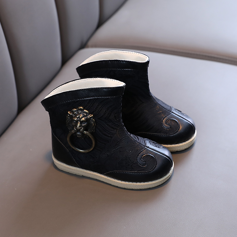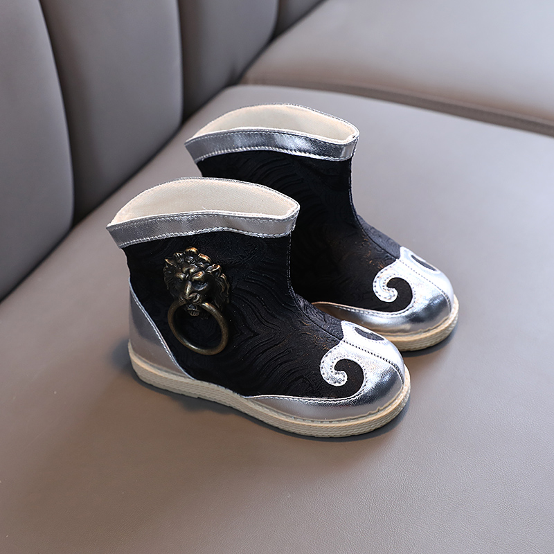 Old Beijing hand-made shoes boy spring short boots bright children Han clothing boots warp bow shoes ancient antique shoes