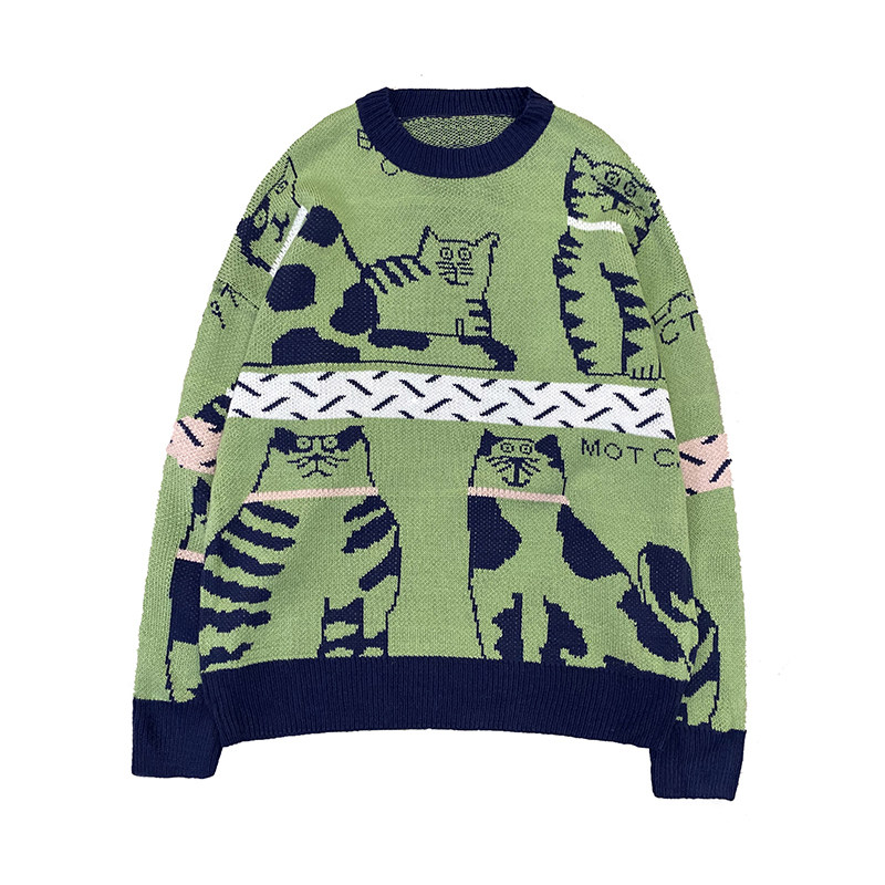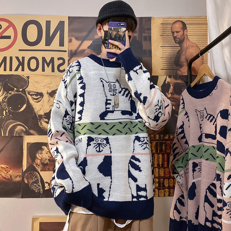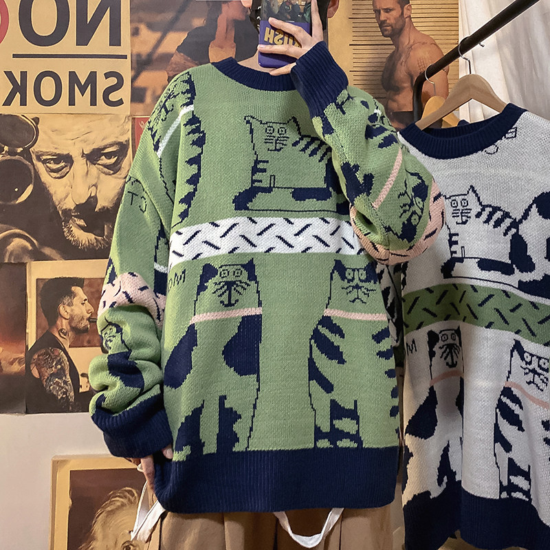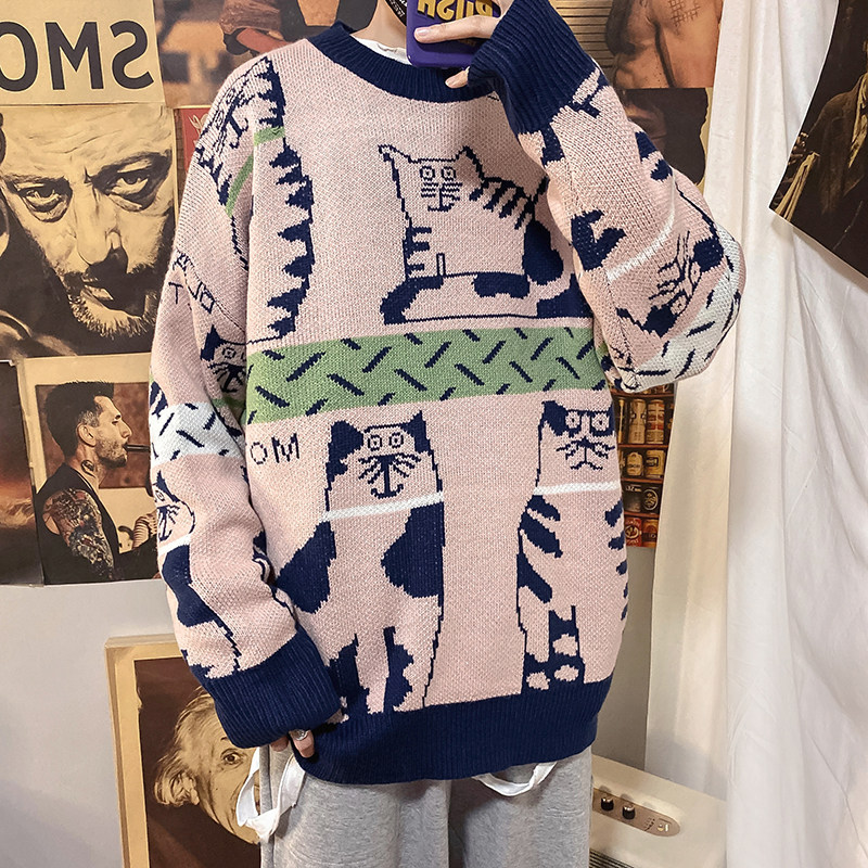 Lazy Wind Cec Cartoon Collision Color Sweater Male Autumn Winter Ins port Wind trendy lovers Knitted Sweatshirt Loose Casual Sanitary Clothing