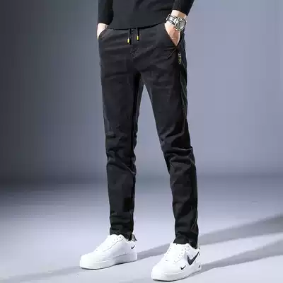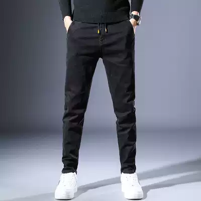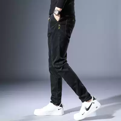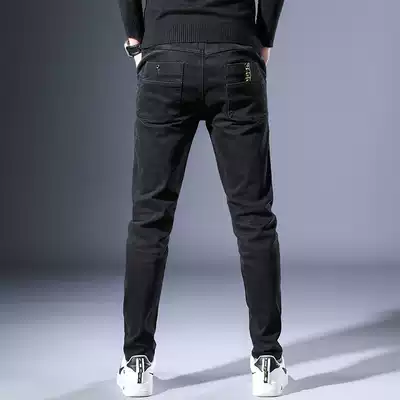 Hong Kong high-end jeans men's Tide brand autumn and winter slim feet versatile black plus velvet casual long pants men
